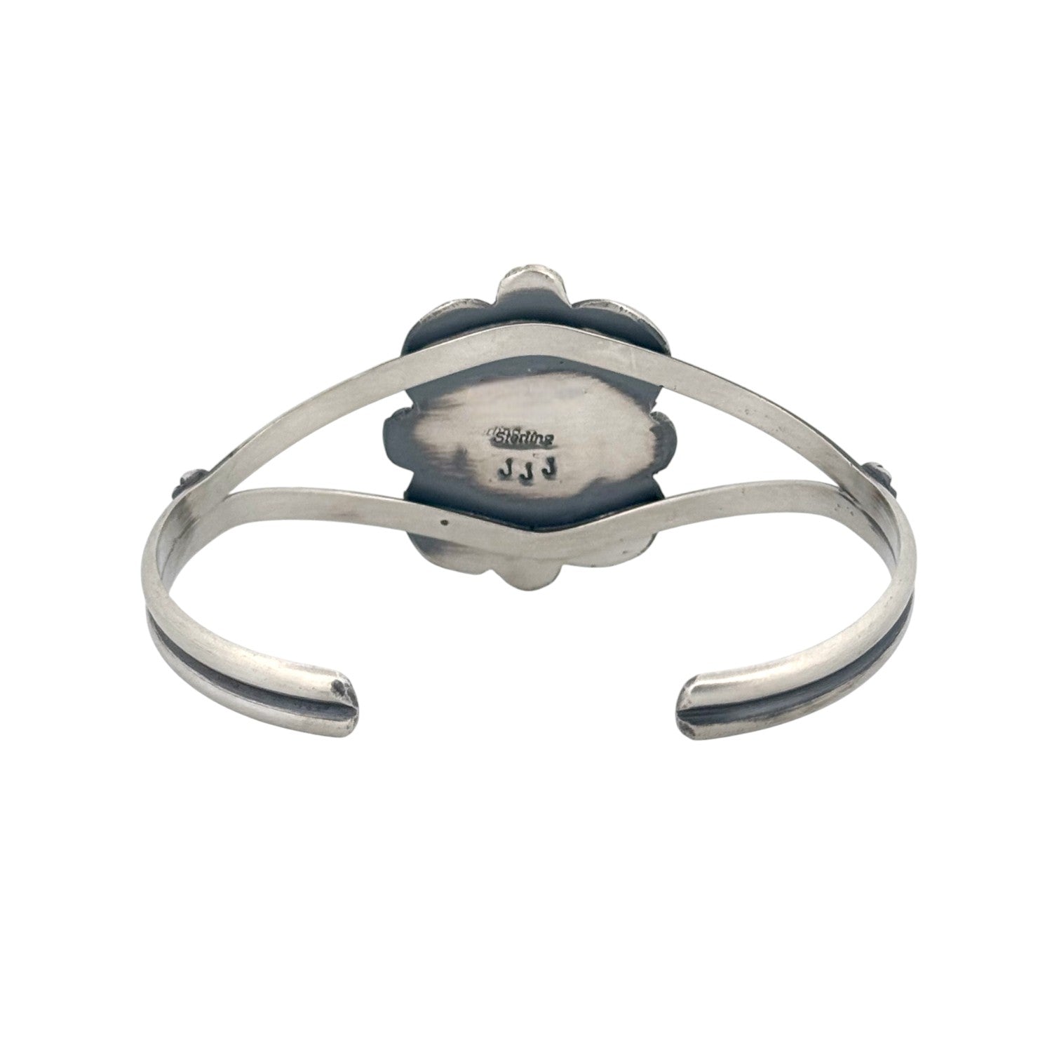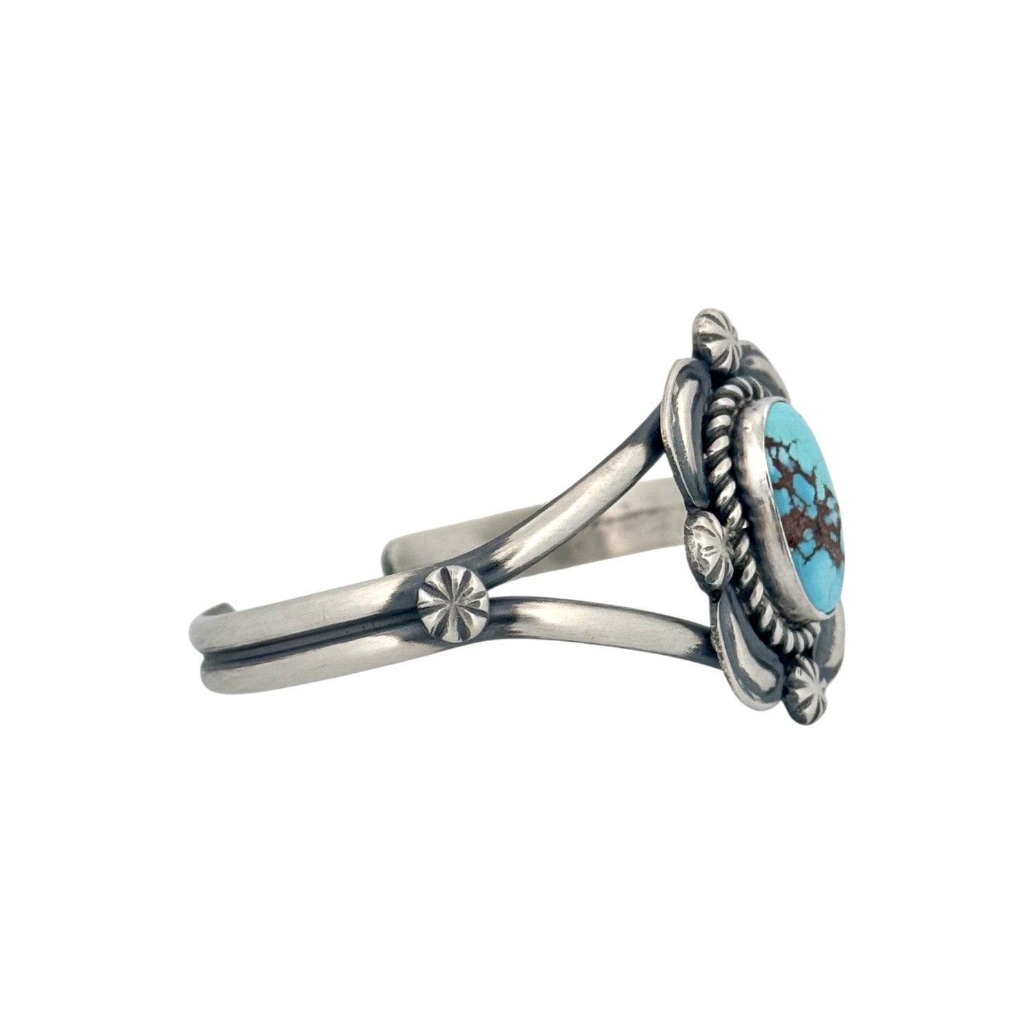 This elegant Navajo handmade bracelet by Jeff James Jr. highlights the captivating beauty of Golden Hills Turquoise. The centerpiece stone features soft sky-blue tones with distinctive golden-brown matrix patterns, set securely in a polished sterling silver bezel. Surrounding the turquoise are hand-stamped silver details, including traditional Navajo scalloped and flower motifs, adding depth and artistry to the design. The split-shank cuff enhances balance and comfort, while emphasizing the stone’s natural radiance. Each element of this bracelet reflects Jeff James Jr.’s skill and respect for Navajo silversmithing traditions.