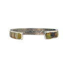 This sophisticated bracelet by acclaimed Navajo artist Lester James showcases his signature precision and artistry. The cuff features a beautifully executed inlay design of Damele turquoise, known for its unique blend of soft greens, golds, and browns with subtle matrix patterns. Each stone is expertly hand-cut and seamlessly set into a sleek sterling silver band, creating a refined and contemporary aesthetic rooted in tradition. The smooth inlay work highlights James’s mastery of balance and craftsmanship, achieving both elegance and durability. With its understated yet captivating design, this piece reflects the harmony between natural stone and fine silverwork.