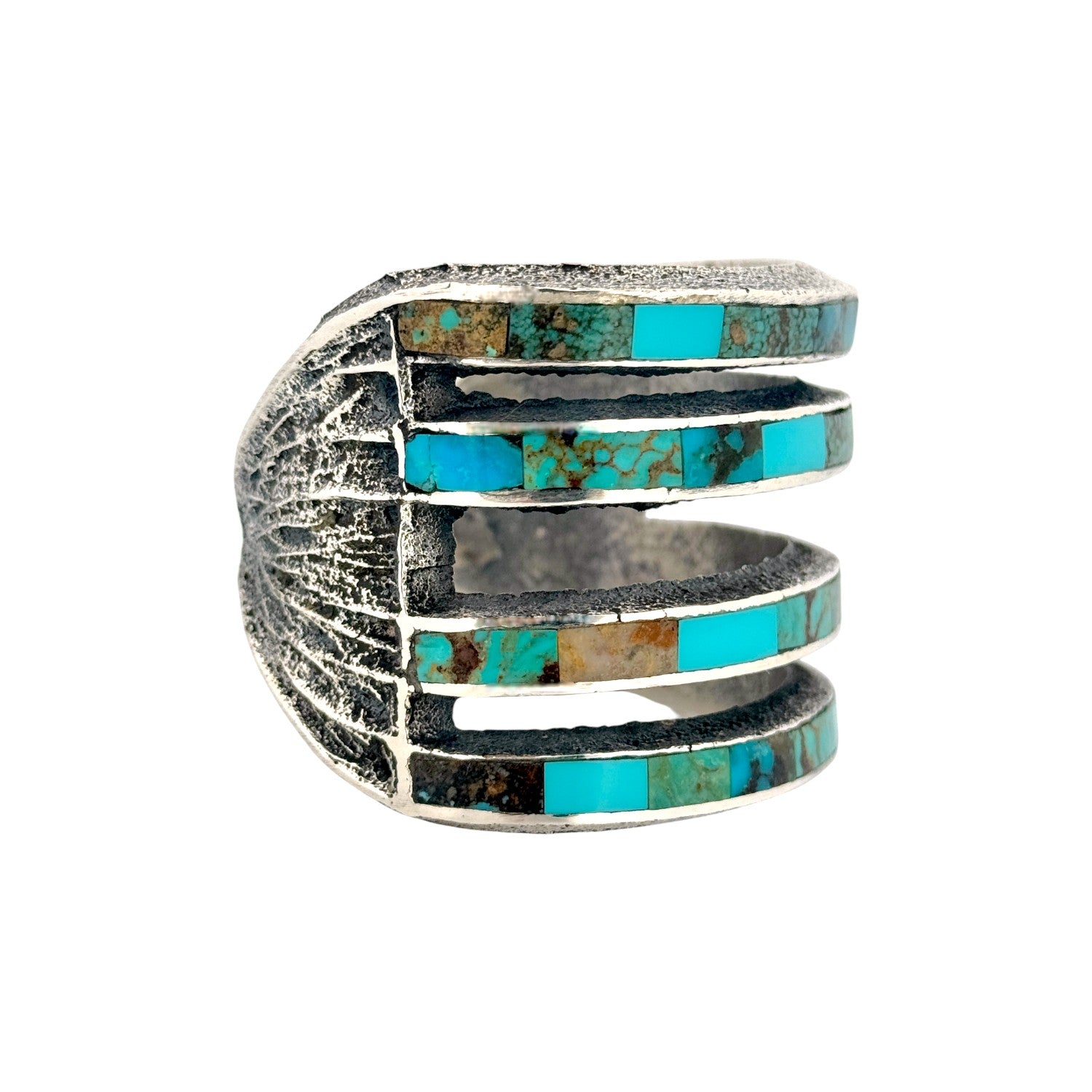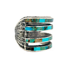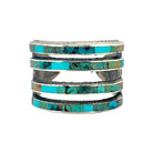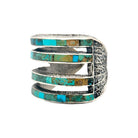 This stunning bracelet by Navajo artist Lester James showcases his signature precision inlay work with vibrant Kingman turquoise set in sterling silver. Each stone is meticulously hand-cut and inlaid across five horizontal silver bands, creating a striking mosaic of blue and green tones accented by natural matrix patterns. The open, multi-bar design gives the piece both visual depth and modern balance, while maintaining a traditional Navajo aesthetic. The textured silver background contrasts beautifully with the polished turquoise, enhancing the bracelet’s dimensional appeal.