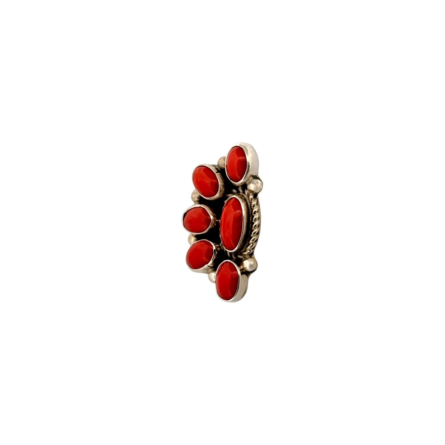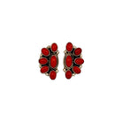 These Geraldine James earrings are a beautiful example of Navajo handmade sterling silver craftsmanship. Each earring features a vibrant coral cluster, with rich red cabochons arranged in a classic Southwestern design. A central oval coral stone is framed by twisted rope detailing and surrounded by smaller coral accents for added depth and balance. Oxidized silver enhances the contrast, highlighting the intricate beadwork and traditional styling. Bold yet elegant, these earrings embody timeless Native American artistry with striking color and refined detail.
