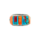 This vibrant ring by Navajo artist Lester James showcases a stunning inlay of multi-stone artistry set in sterling silver. The bold design features Kingman Turquoise, Red Spiny Oyster Shell, and Orange Spiny Oyster Shell, each stone carefully hand-cut and fitted together in a seamless mosaic. The rich contrast of fiery orange, deep red, and bright blue creates a striking visual rhythm that reflects the natural beauty of the Southwest. The silver band has a textured finish, enhancing the organic feel of the piece and highlighting the brilliance of the inlay work. Meticulously handcrafted, the ring demonstrates James’ precision and skill in blending traditional Navajo techniques with contemporary style. Its wide band gives it a strong presence, making it a statement piece for any collection.