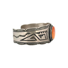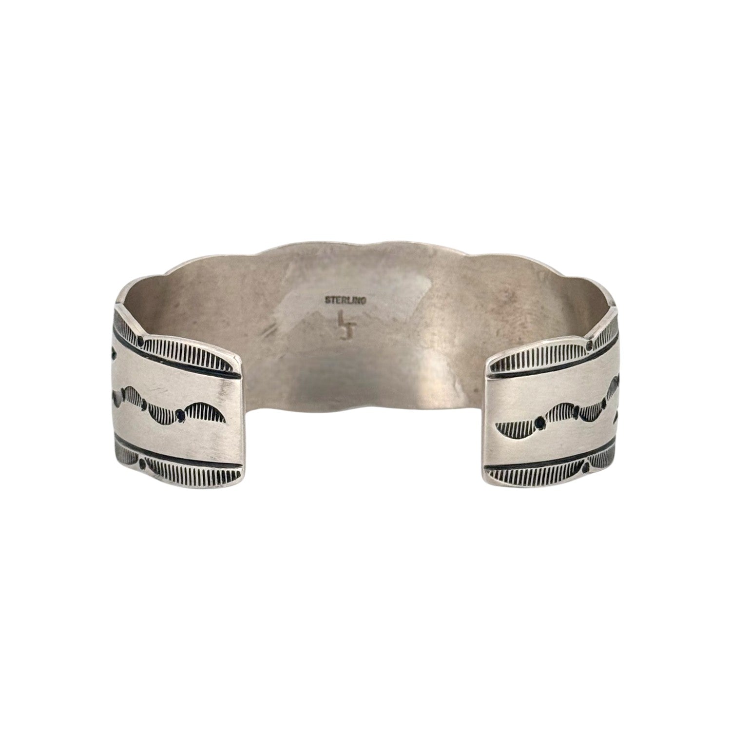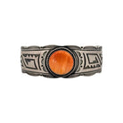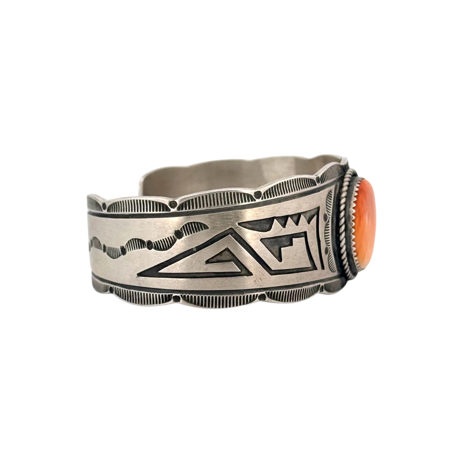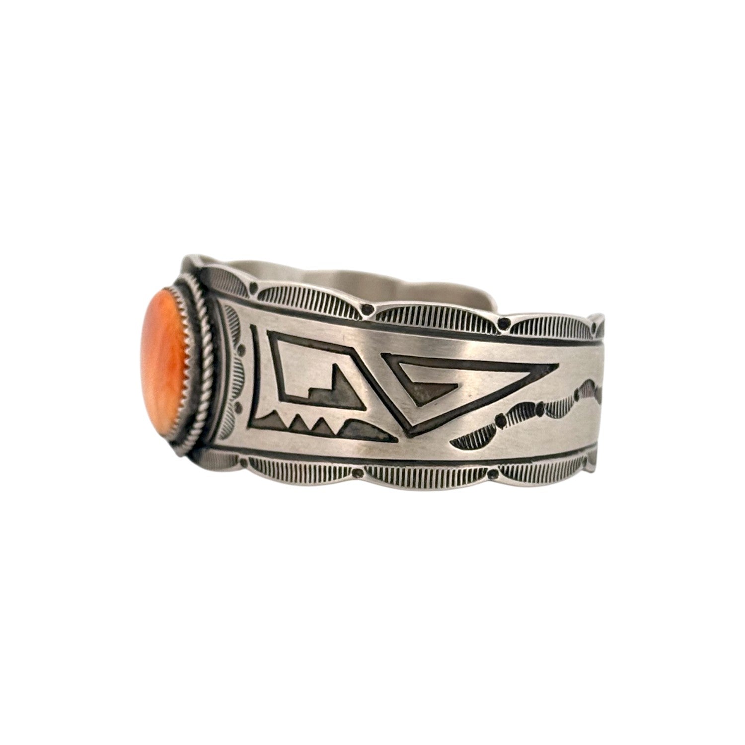 This exceptional Navajo handmade bracelet by Leonard Jim showcases a radiant Orange Spiny Oyster Shell set in finely crafted sterling silver. The vibrant shell glows with warm coral and amber tones, symbolizing strength and creativity. Surrounding the centerpiece, Leonard Jim’s signature stamp work and detailed geometric designs highlight his masterful silversmithing and deep connection to Navajo tradition. The bracelet’s scalloped edges and oxidized finish enhance the dimensional beauty of the hand-tooled patterns.