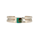 This beautifully handcrafted bracelet by Navajo silversmith Harold Joe highlights a striking Kingman turquoise stone set in sleek sterling silver. The vivid blue-green gemstone, marbled with a warm brown matrix, sits boldly at the center of a clean, open two-bar cuff design. Joe’s craftsmanship balances modern minimalism with the spirit of Navajo tradition, allowing the natural beauty of the turquoise to take center stage. The smooth silverwork and geometric form create a sense of strength and sophistication. Each angle and curve reflects precision and harmony, hallmarks of Harold Joe’s artistry.