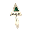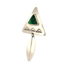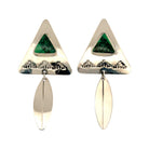 These Navajo handmade earrings by Harold Joe feature a striking combination of variscite and sterling silver in a bold geometric design. Each earring showcases a triangular silver form inlaid with a rich green variscite stone, known for its intricate matrix and soothing tones. Below, a sleek silver feather dangle adds graceful movement and traditional symbolism. Intricate cutout patterns enhance the design, reflecting Navajo artistry and spiritual motifs.