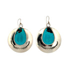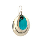 These Navajo handmade earrings by Harold Joe feature exquisite Water Web Kingman turquoise set in polished sterling silver. The teardrop-shaped turquoise stones display a vivid blue hue accented by striking matrix patterns, characteristic of the Kingman mine. Each stone is framed by elegant hand-stamped silverwork that adds texture and traditional Navajo artistry. The circular silver base enhances the natural beauty of the turquoise, creating a harmonious balance of color and shine.