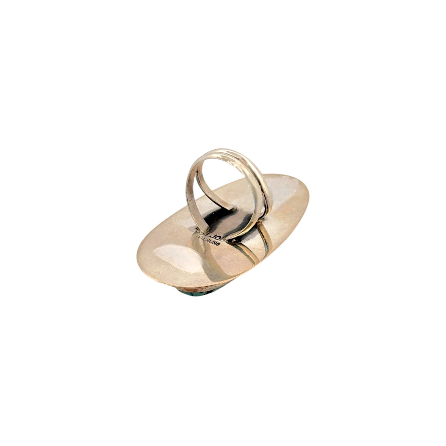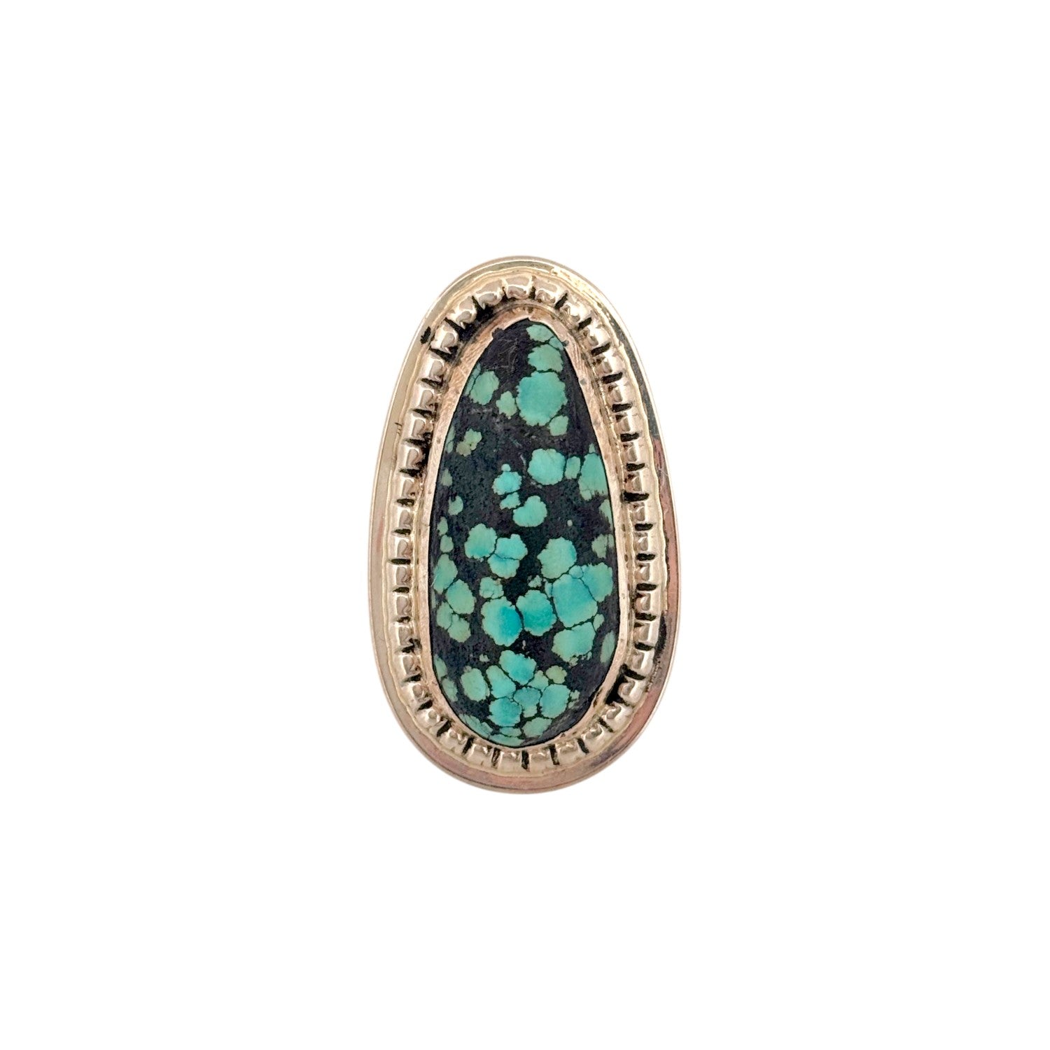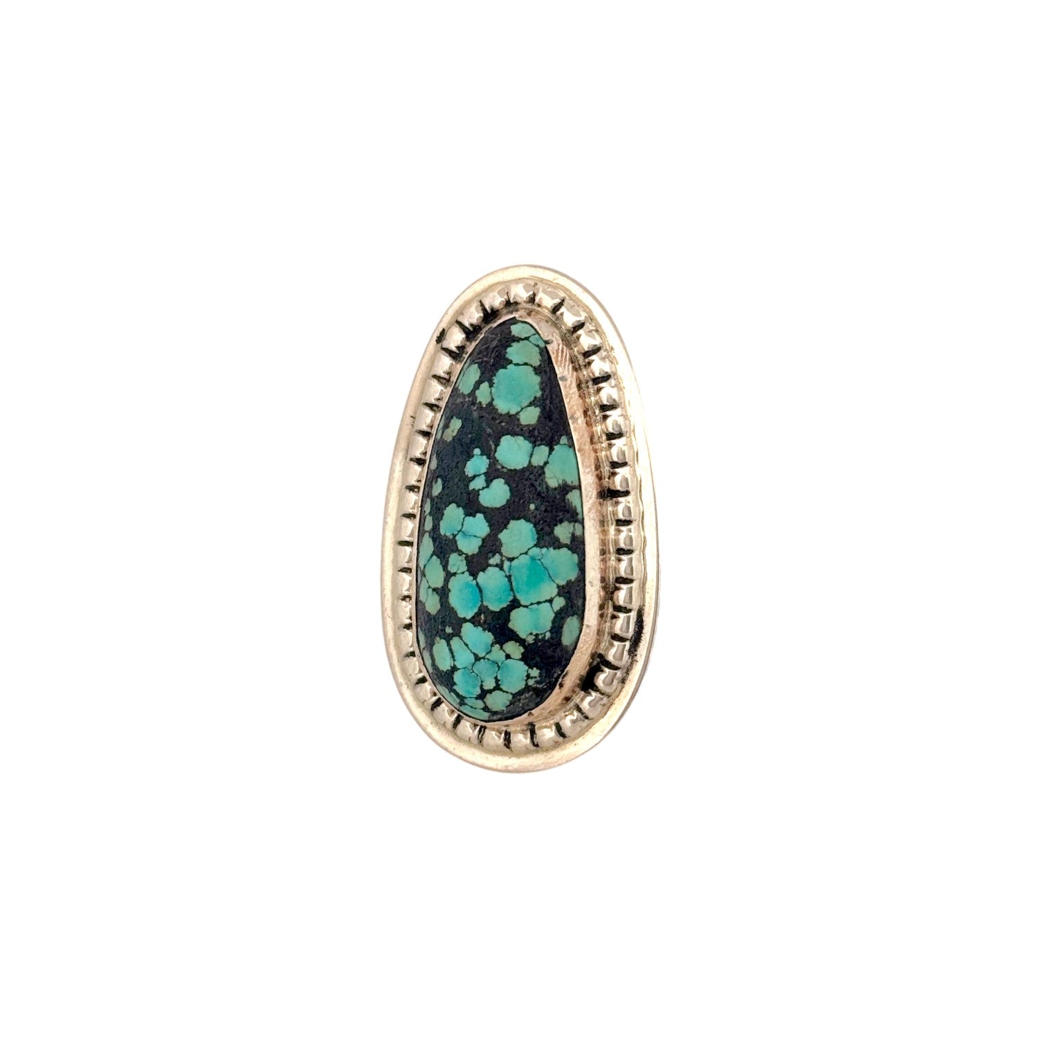 This striking Navajo handmade ring by Harold Joe features a beautiful Blue Apaloosa stone, known for its rich green-blue tones set against a dark, contrasting matrix. The elongated teardrop-shaped cabochon is expertly polished, highlighting the stone’s distinctive clustered pattern and natural character. Set in sterling silver, the ring is framed with a detailed stamped border that adds depth and texture while enhancing the stone’s bold presence. The clean yet intricate design reflects the artist’s skilled craftsmanship and dedication to traditional Navajo silversmithing techniques. This unique piece captures the rugged beauty of China Mountain Turquoise and makes a standout addition to any collection.