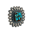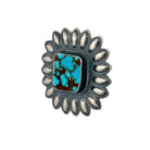 Expertly handcrafted by Navajo silversmith Robert Johnson, these Water Web Kingman Turquoise earrings embody timeless elegance and authentic Southwestern artistry. Each square-cut turquoise stone is hand-selected for its rare water web matrix, showcasing a vivid contrast of deep blue and chocolate brown veining unique to the Kingman mine. Set in finely polished sterling silver, the stones are framed by a radiant hand-stamped floral border that reflects Johnson’s exceptional skill and attention to detail. The design strikes a perfect balance between bold presence and refined sophistication, making these earrings a true collector’s piece. Their lightweight construction ensures comfortable wear while maintaining their heirloom quality and strength.