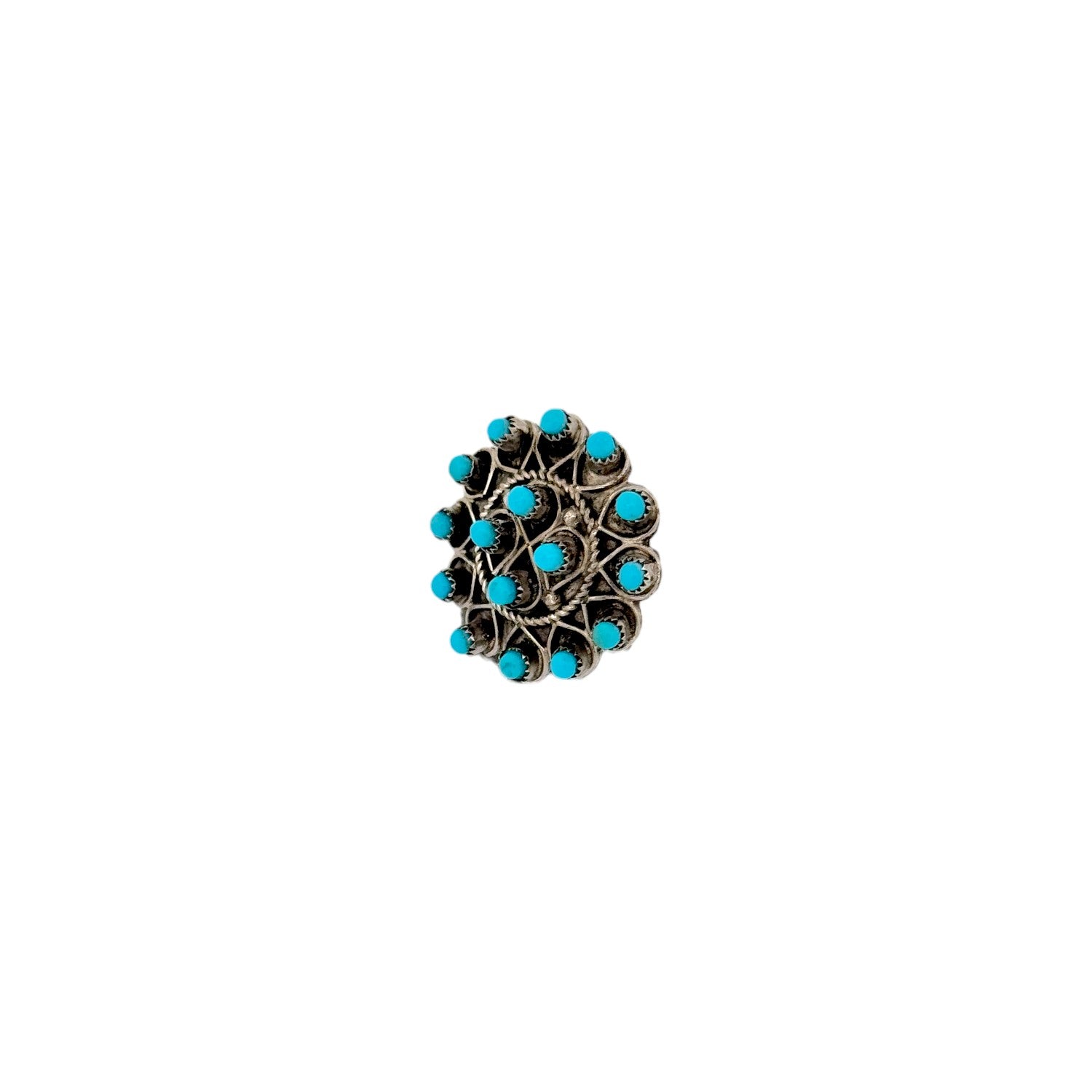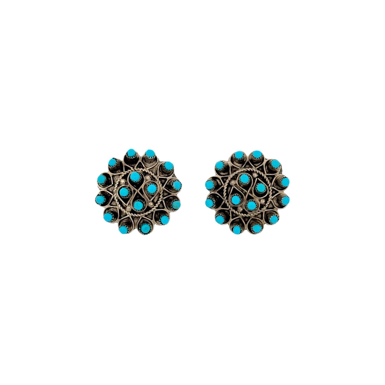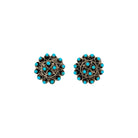 These Navajo handmade earrings by Wayne Johnson feature vibrant Kingman turquoise set in beautifully detailed sterling silver. Each round cluster showcases petite turquoise stones arranged in a traditional radial design, creating depth and symmetry. Intricate silverwork weaves throughout the setting, adding texture and dimension to the bold turquoise accents. The bright blue tones of Kingman turquoise contrast strikingly against the oxidized silver background. Timeless and finely crafted, these earrings reflect classic Navajo artistry with enduring Southwestern elegance.