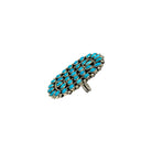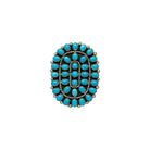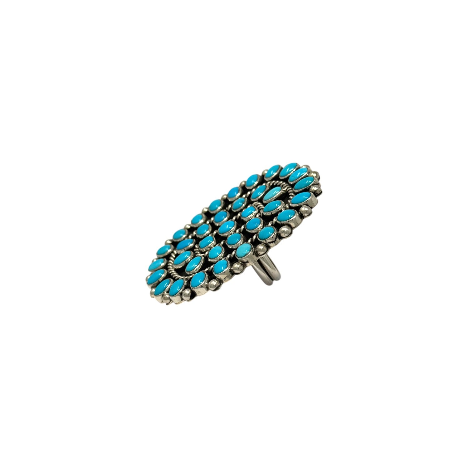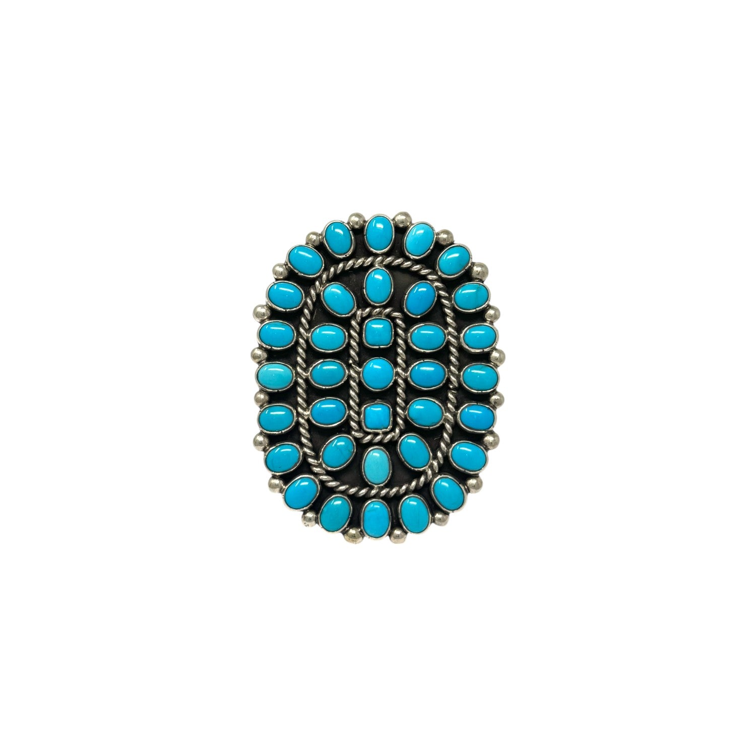This exquisite ring by Melvin & Tiffany Jones showcases the timeless elegance of Sleeping Beauty Turquoise, revered for its vibrant sky-blue hue. Set in radiant sterling silver, the ring features a traditional cluster design, with meticulously hand cut stones arranged in a bold oval formation. Each turquoise cabochon is securely bezel set and framed by classic Navajo twist wire and silver beading, highlighting the artisans’ fine craftsmanship. A true statement piece, the ring pays homage to generations of Navajo silversmithing while offering modern versatility with an adjustable band for a customized fit.