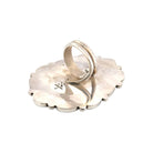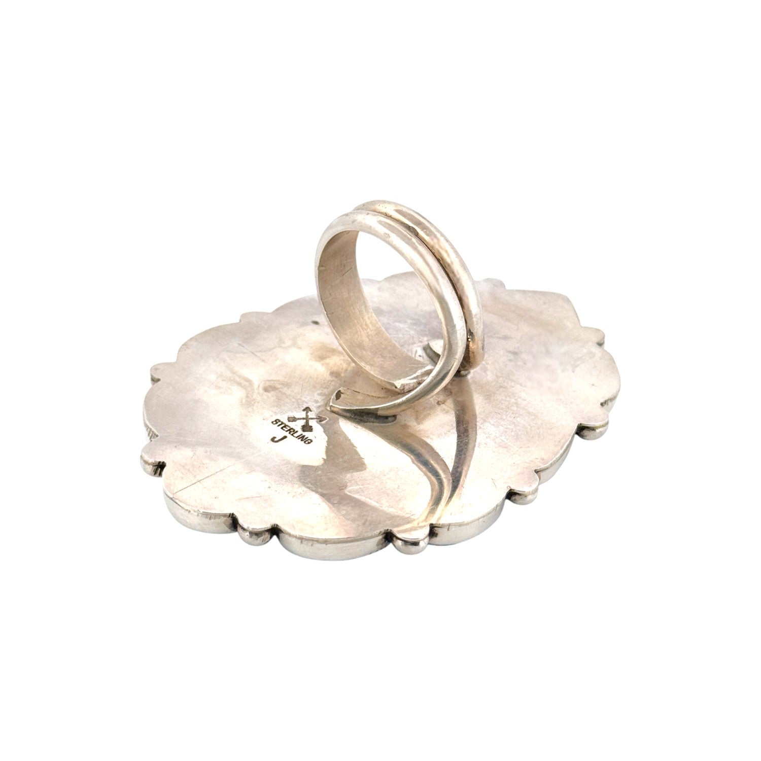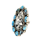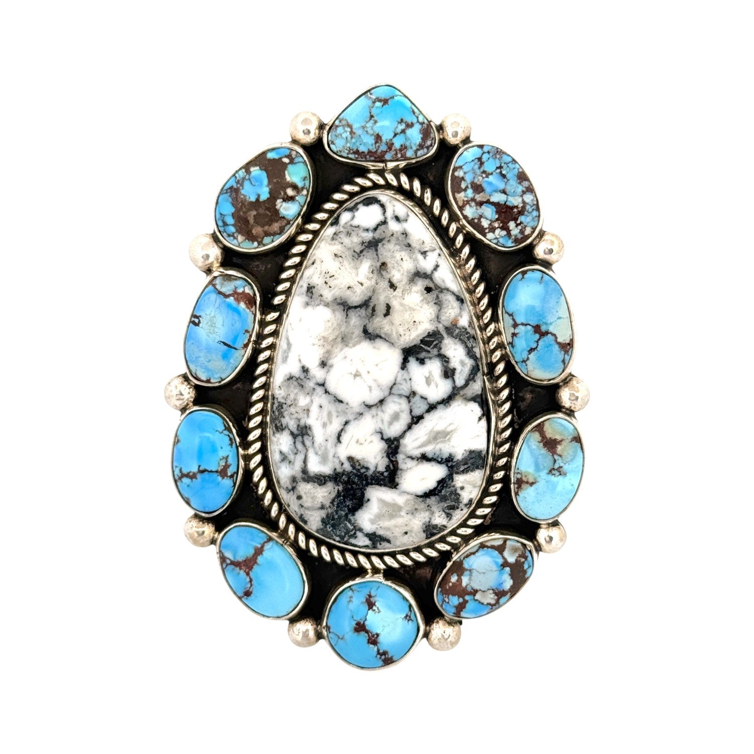 This breathtaking ring by Navajo artists Melvin and Tiffany Jones beautifully unites the striking contrast of White Buffalo Turquoise with the vivid sky-blue tones of Golden Hills Turquoise. The large teardrop-shaped White Buffalo stone takes center stage, its dramatic black-and-white matrix resembling clouds drifting across a desert sky. Surrounding it, a cluster of hand-cut Golden Hills cabochons adds a burst of color and balance, each set in finely crafted sterling silver bezels. Twisted silver rope detailing and polished silver drops frame the stones, showcasing the artists’ meticulous attention to detail. The combination of these rare and sought-after stones makes this piece truly one of a kind.