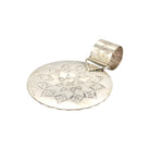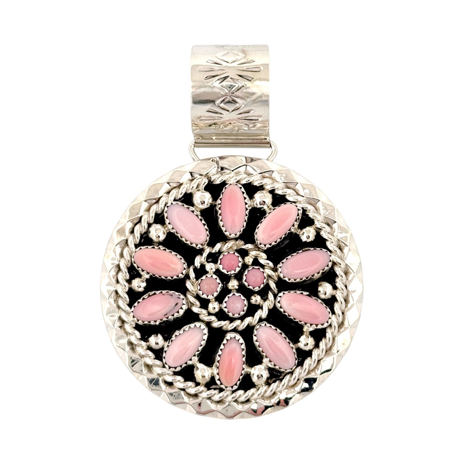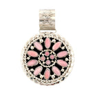 This exquisite pendant by Navajo artist Brian Jones radiates elegance and traditional beauty through its intricate craftsmanship and soft color palette. Set in sterling silver, the piece features a circular cluster design adorned with polished pink conch shell stones, each hand-cut and arranged in a graceful spiral pattern. The delicate shades of blush and rose create a calming harmony against the dark oxidized background, emphasizing the fine detail of the silverwork. Twisted rope borders and tiny silver beads frame the stones, showcasing Jones’s mastery of balance and texture. The large, hand-stamped bale adds both strength and sophistication, completing the pendant with Navajo artistry’s signature refinement.