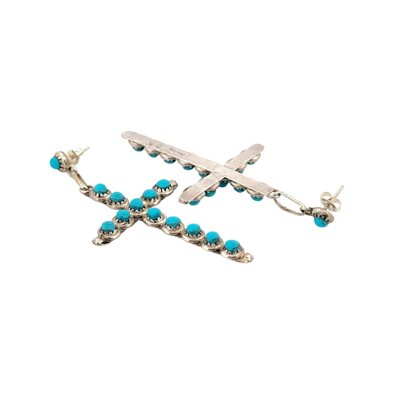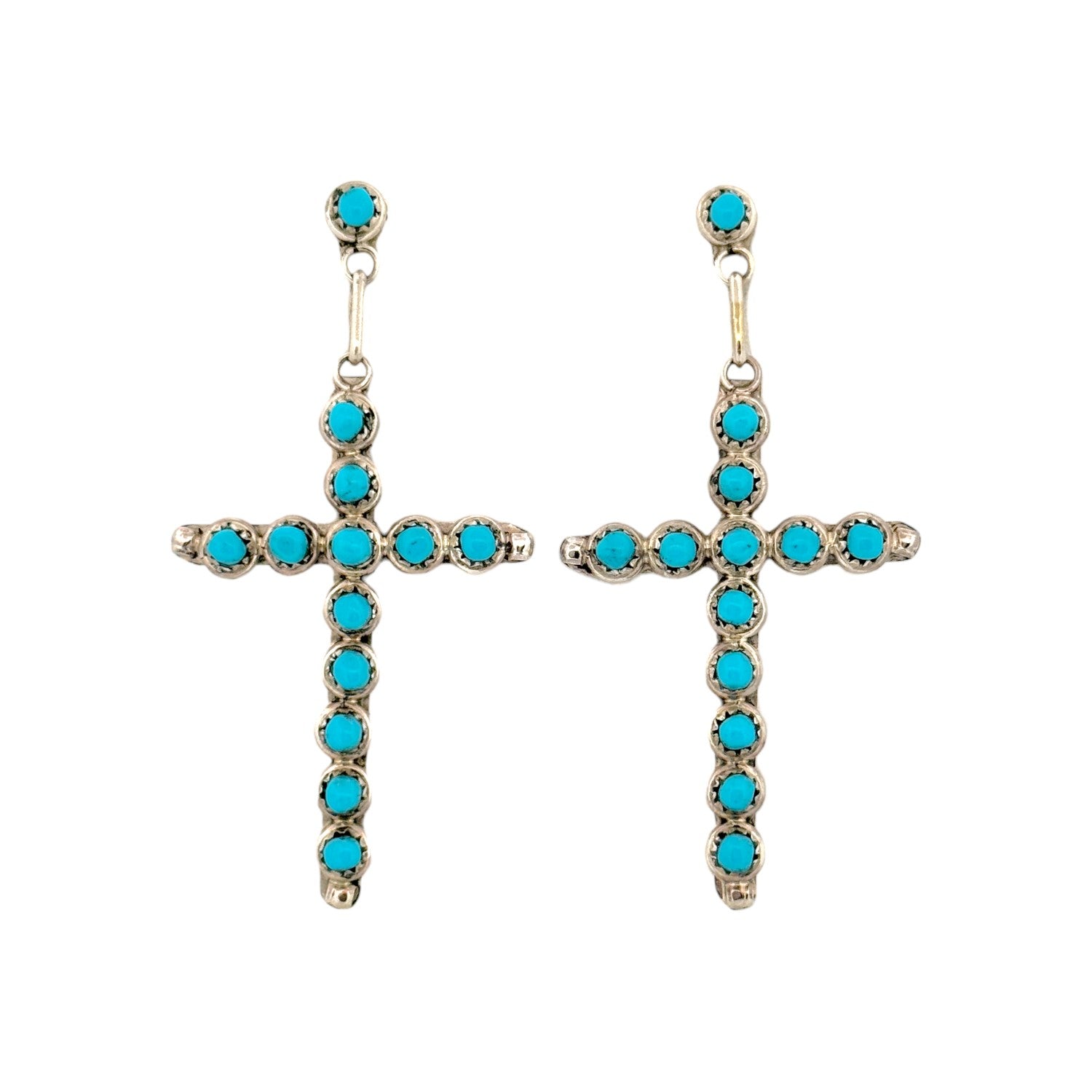 These exquisite earrings by Navajo artist Davis Kaamasee feature radiant Sleeping Beauty Turquoise stones, renowned for their vivid sky-blue hue and flawless clarity. Each cross-shaped earring is meticulously handcrafted from sterling silver, with individually set turquoise cabochons creating a stunning, balanced design. The intricate silverwork surrounding each stone highlights Kaamasee’s precision and mastery of traditional Navajo silversmithing techniques. Symbolizing protection and harmony, the cross motif carries both spiritual meaning and timeless Southwestern style. Lightweight and elegant, these earrings move beautifully and add a touch of refined artistry to any look.