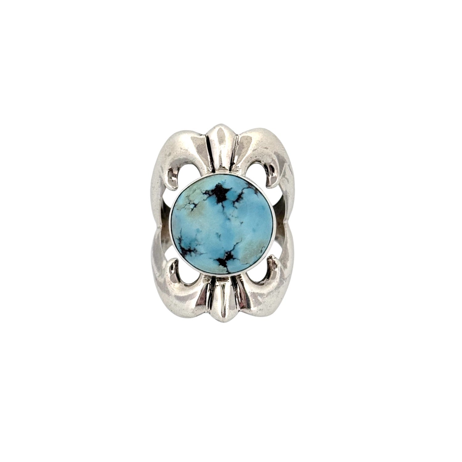 This captivating Navajo handmade ring showcases a stunning Golden Hills Turquoise stone, prized for its soft sky-blue color and delicate matrix patterns. The gemstone is beautifully framed in a sculpted sterling silver setting, featuring graceful cutout designs that add elegance and depth. Each curve and contour of the silverwork reflects the artisan’s mastery, blending traditional Navajo style with modern refinement. The high-polished finish enhances the turquoise’s natural brilliance, creating a timeless and balanced composition. Handcrafted with care, this ring carries the spirit of Navajo artistry and the natural beauty of the Southwest.
