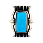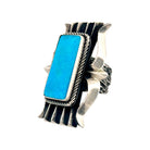This vintage Navajo handmade ring by Kevin Yazzie, crafted circa 2000s, features a stunning Water web Kingman turquoise stone set in sterling silver. The rectangular turquoise showcases a vibrant sky-blue hue with subtle web-like matrix patterns, a hallmark of the renowned Kingman mine. Framed in a twisted silver rope bezel, the stone is accented by bold sculptural silverwork that radiates outward, creating a striking visual balance. The oxidized detailing adds depth and contrast, emphasizing both the turquoise’s brilliance and the artisan’s craftsmanship. Kee’s work beautifully blends traditional Navajo silversmithing with a modern, architectural design aesthetic.