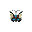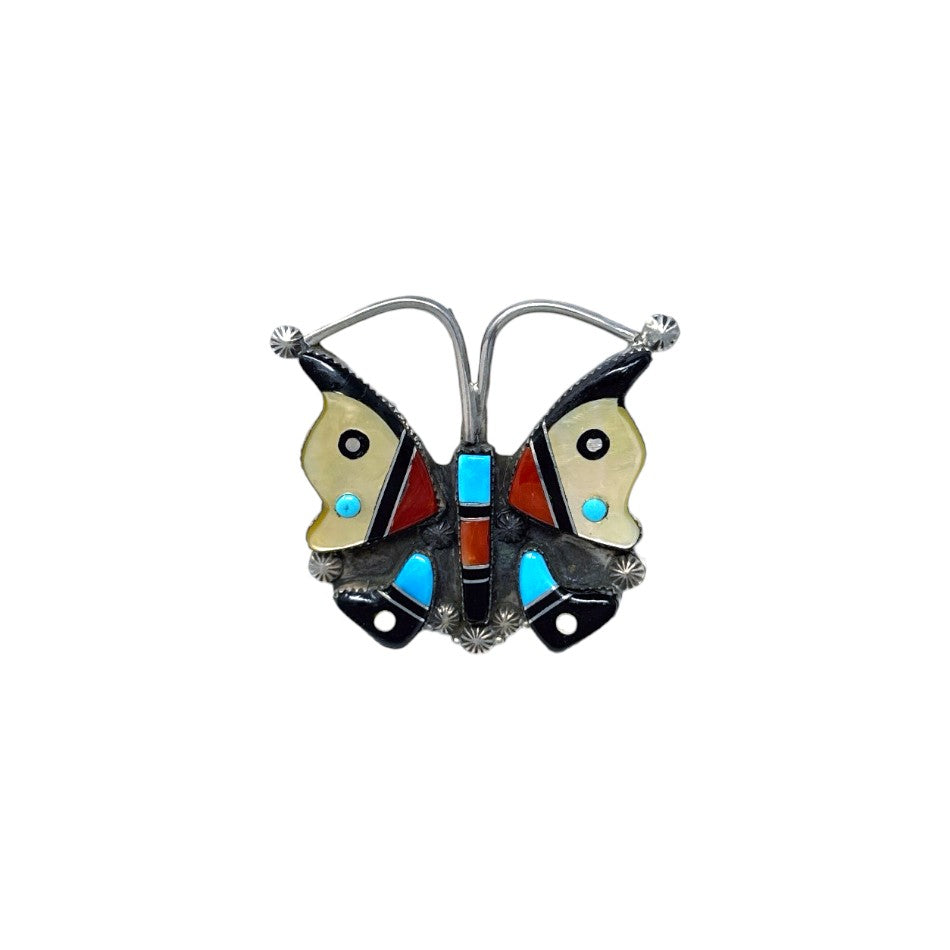 This enchanting pin and pendant by Elvira Kiyite captures the graceful form of a butterfly, a symbol of transformation and beauty in many Native traditions. Handcrafted by a skilled Zuni artisan, this piece is masterfully inlaid with multi-stone materials including jet, yellow shell, coral, and Kingman Turquoise. Each stone is meticulously cut and set into sterling silver, creating vivid patterns that bring the butterfly to life with movement and vibrancy. The symmetry and color balance highlight Elvira Kiyite’s attention to traditional design and fine detail.