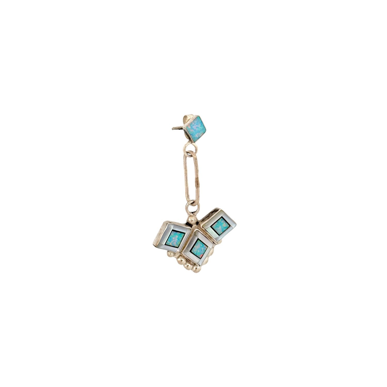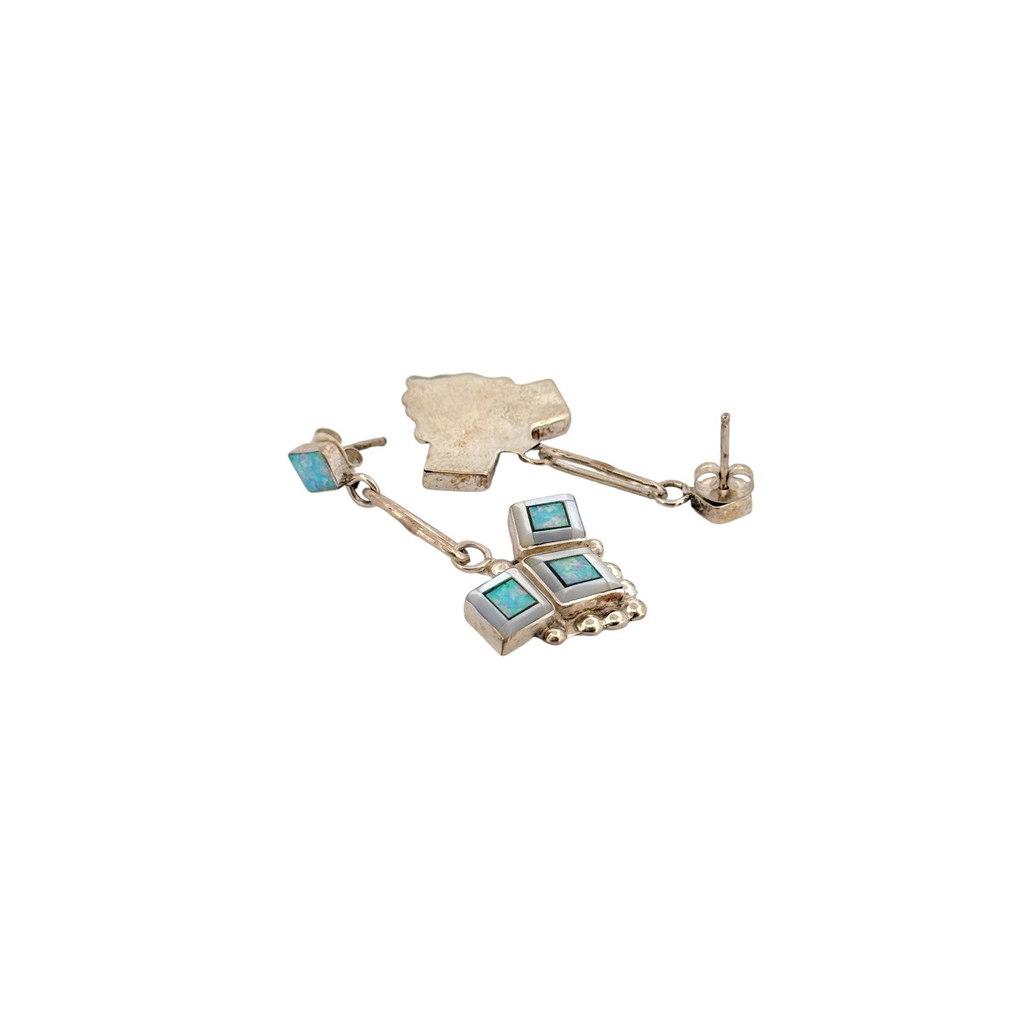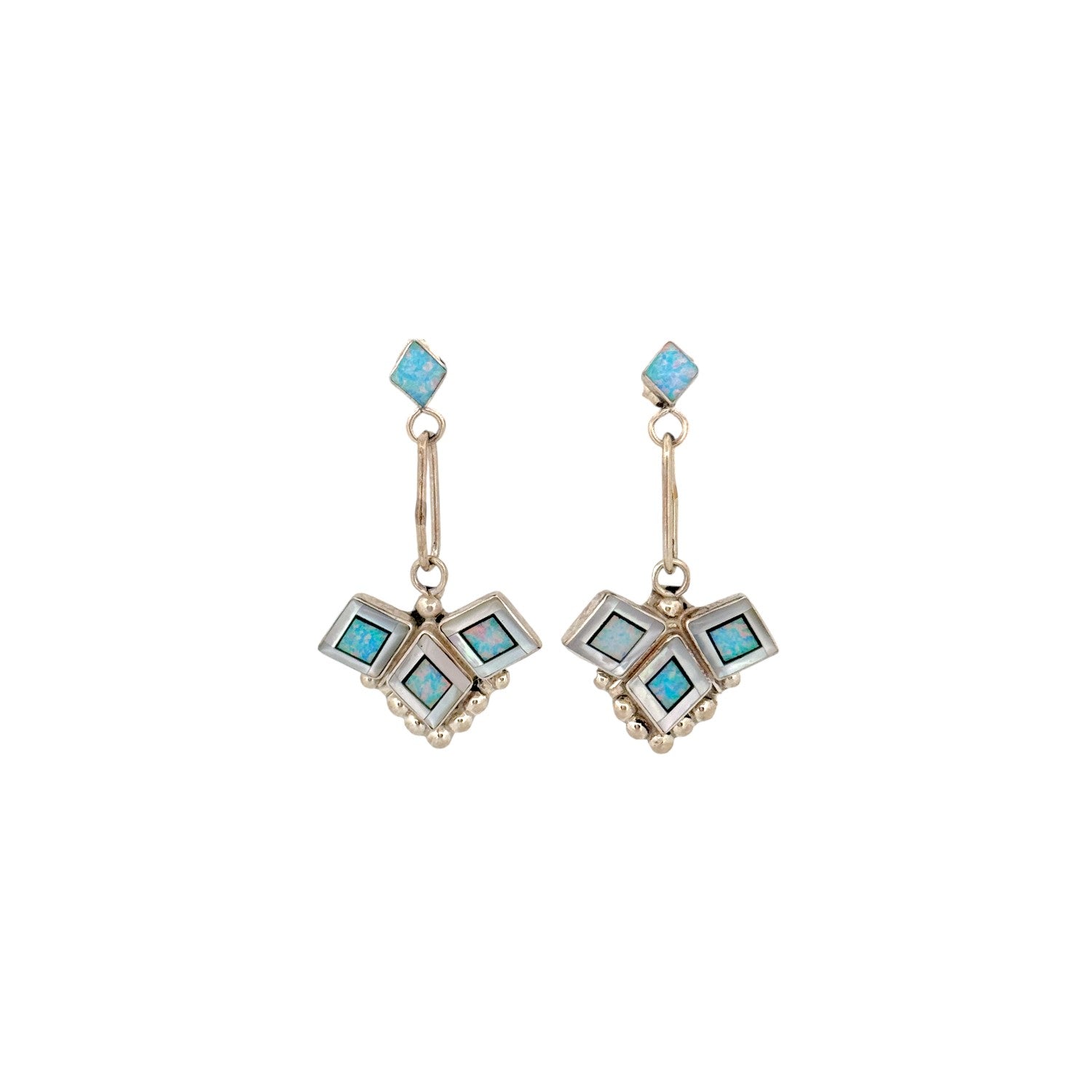 Willis Kylestewa Zuni handmade earrings showcase a striking inlay of opal, jet, and mother of pearl set in sterling silver. Carefully hand-cut stones are fitted together in a seamless mosaic, highlighting the precision and artistry of traditional Zuni inlay work. The luminous opal flashes with subtle color, beautifully contrasted by the deep black jet and the soft iridescence of mother of pearl. Polished sterling silver frames the design, enhancing both the clean lines and vibrant materials. Elegant and thoughtfully crafted, these earrings reflect the refined balance and heritage of Zuni jewelry artistry.