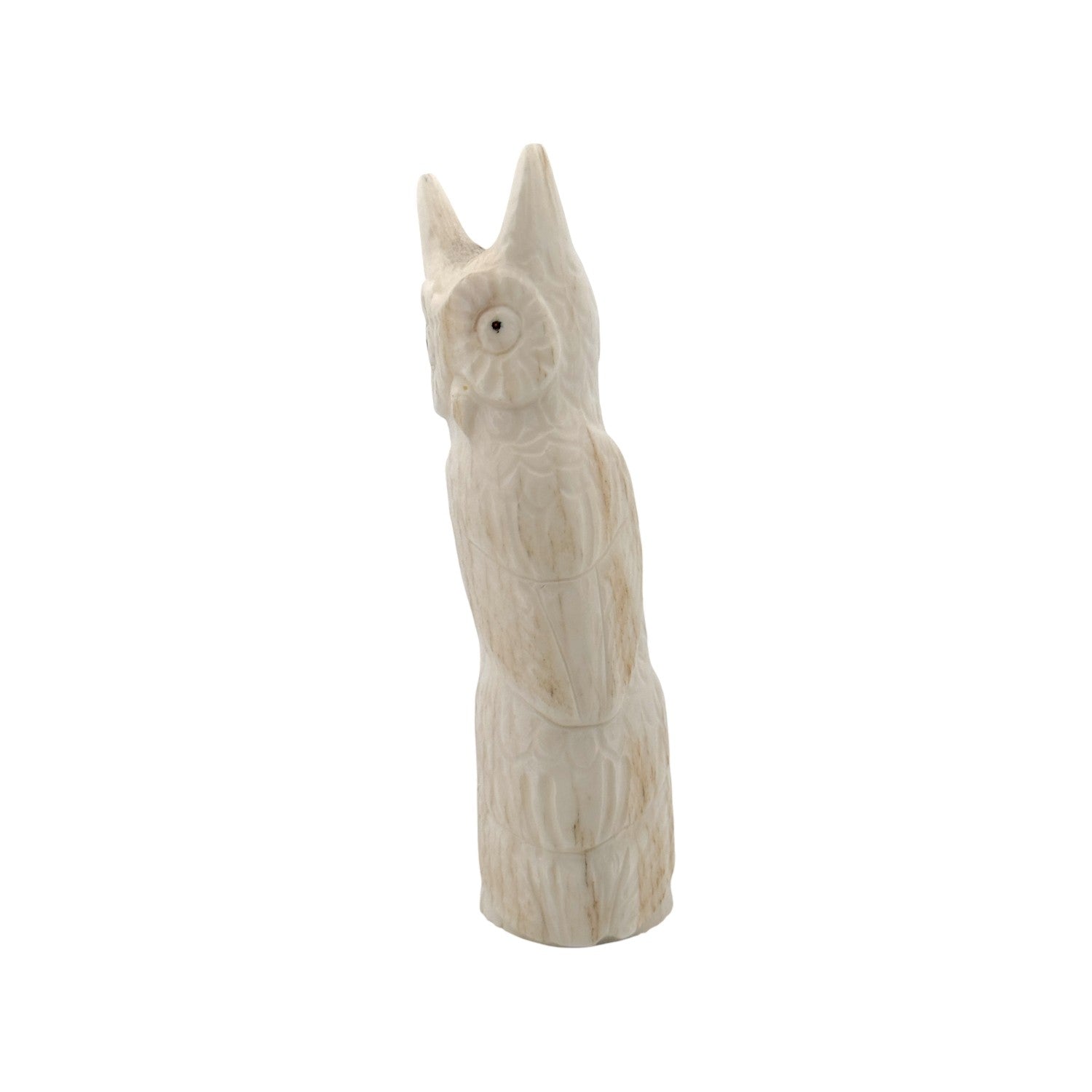 This Zuni hand-carved Owl Fetish by Maxx Laate is skillfully sculpted from natural antler, showcasing the material’s creamy tones and subtle organic striations. The owl’s tall, elegant form is accentuated by finely carved feather details and a softly defined facial disk that draws attention to its watchful gaze. Its upright posture conveys wisdom, protection, and keen perception; qualities traditionally associated with the owl in Zuni culture. The smooth, polished finish enhances the natural beauty of the antler while preserving its distinctive character. Gracefully proportioned and thoughtfully executed, this piece reflects Laate’s refined craftsmanship and the enduring legacy of Zuni carving artistry.