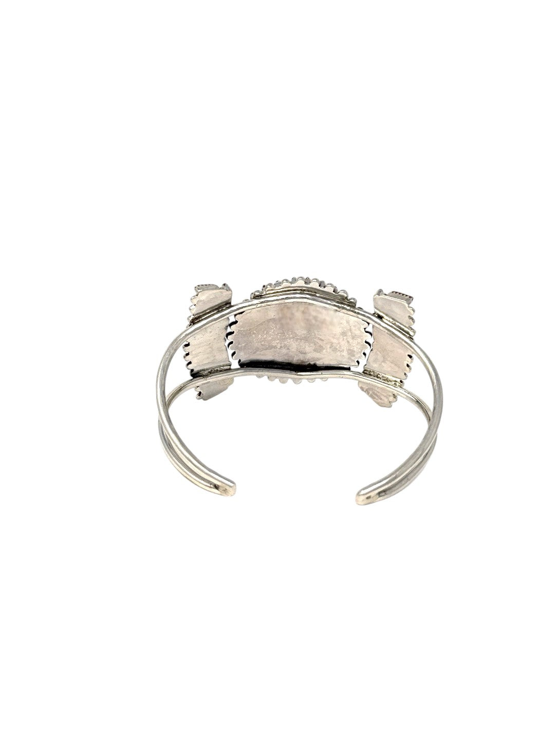 Zuni artist Shirley Lahi, created this sterling silver bracelet that is a masterful display of traditional needlepoint coral work. Each slender piece of hand-cut coral is meticulously set in a radiant sunburst pattern, reflecting the precision and balance that define Zuni jewelry artistry. The warm, rich red of the coral contrasts beautifully with oxidized sterling silver, creating a timeless and elegant design. Every detail down to the tiniest silver bead speaks to Lahi’s exceptional skill and deep cultural heritage. This bracelet is not just jewelry; it’s a wearable piece of Zuni tradition, crafted with care and reverence. A stunning statement for collectors who value authenticity and artistry.