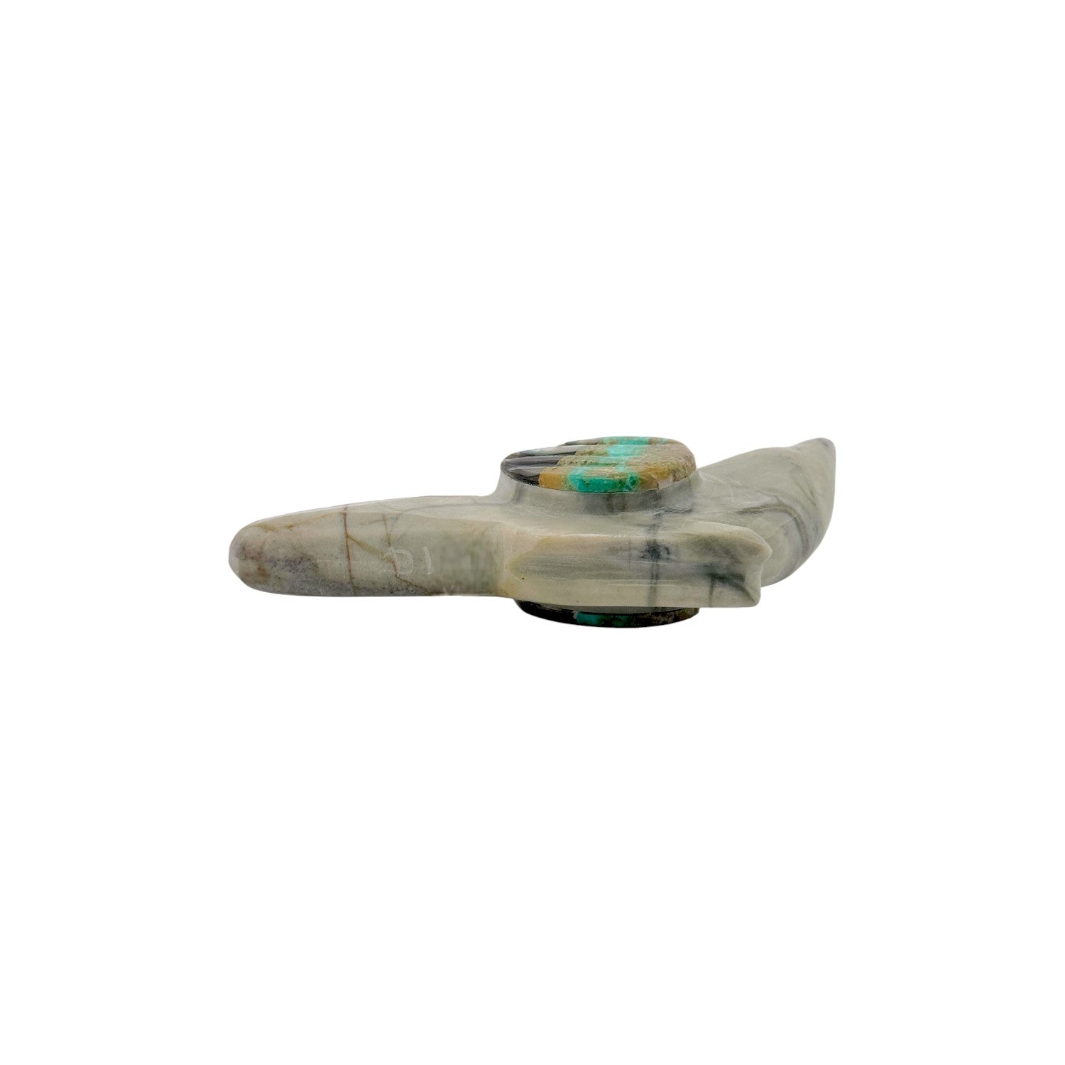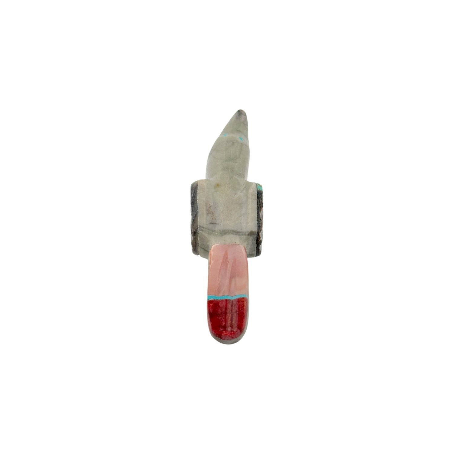 This Zuni hand-carved Bird Fetish by Donovan Laiwakete is sculpted from smooth sandstone, showcasing soft natural striations and warm, earthy tones. The graceful, uplifted form captures a sense of motion and quiet elegance, reflecting the spirit and freedom associated with birds in Zuni tradition. Intricate inlay work features Kingman Turquoise, Sleeping Beauty Turquoise, Coral, Abalone Shell, and Pink Shell, creating a vibrant mosaic of color along the wing and tail. The luminous abalone adds an iridescent shimmer, beautifully balanced by the vivid blues and rich red coral accents. Masterfully carved and polished, this piece embodies harmony, vision, and the enduring artistry of Zuni craftsmanship.