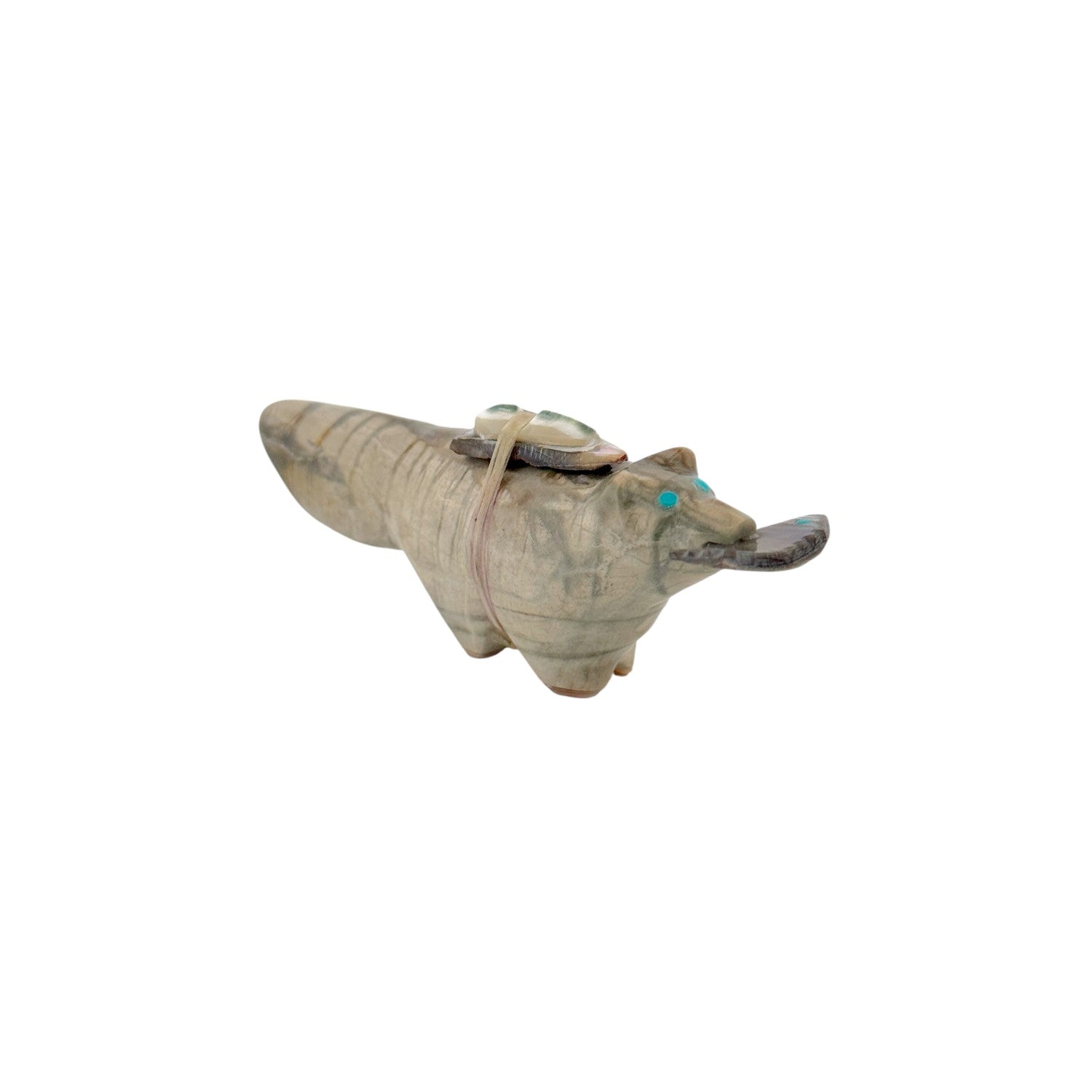 This Zuni hand-carved Fox Fetish by Donovan Laiwakete is sculpted from beautifully patterned Picasso marble, showcasing distinctive veining and natural tonal variation. The fox’s sleek form and alert posture symbolize intelligence, adaptability, and keen awareness within Zuni tradition. A carefully crafted medicine bundle rests along its back, featuring Sleeping Beauty Turquoise, iridescent abalone shell, and soft pink shell accents. The luminous shell and vibrant turquoise create striking contrast against the earthy marble surface. Thoughtfully detailed and expertly polished, this handcrafted piece is a refined example of authentic Zuni artistry and meaningful design.