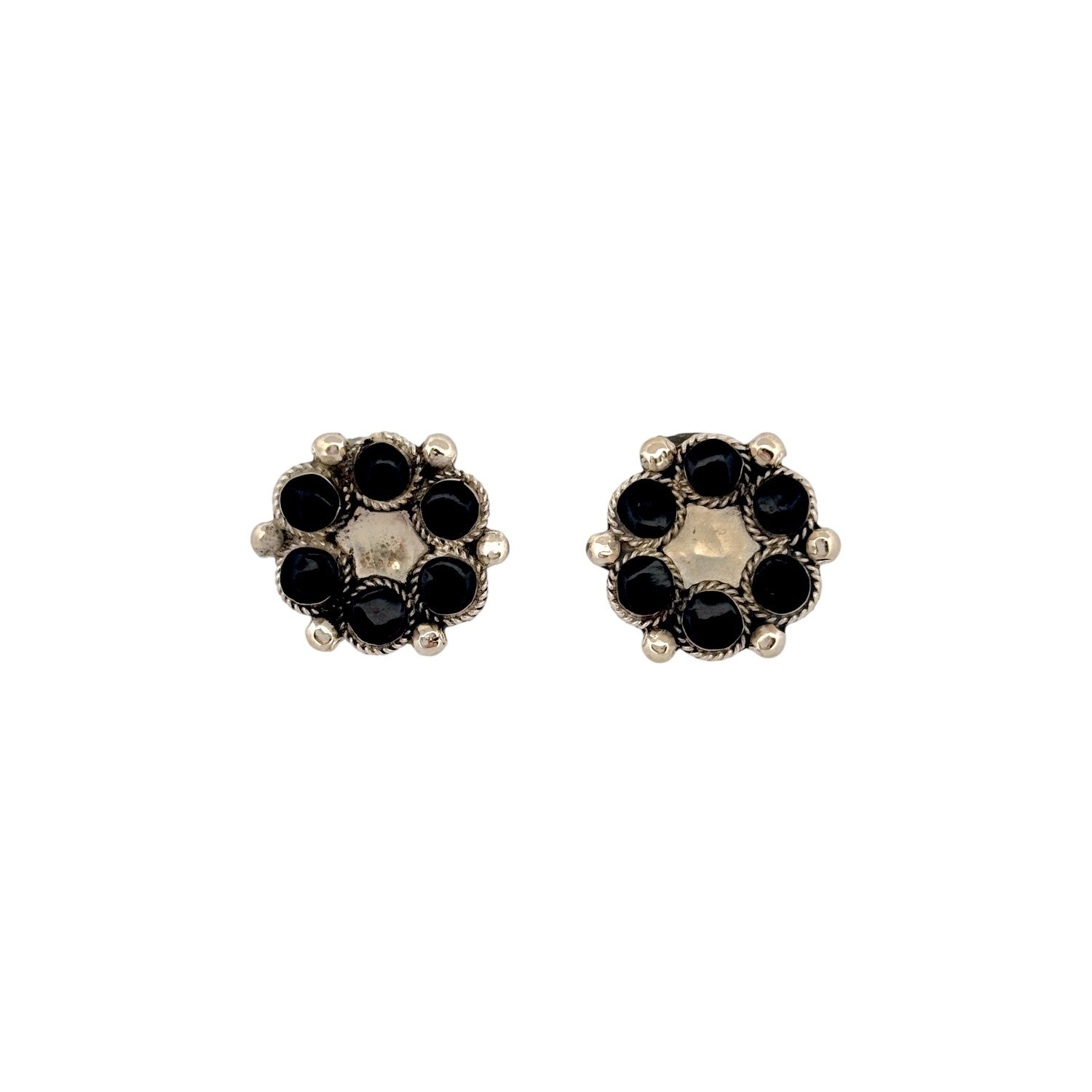 These Zuni handmade earrings by Janice Lalio showcase rich black onyx stones set in classic sterling silver. Each circular cluster features deep, polished onyx cabochons arranged in a symmetrical floral design around a smooth silver center. Twisted rope detailing and silver bead accents add texture and dimension, enhancing the bold contrast between the dark stones and bright silver. The sleek black onyx offers a timeless elegance that pairs effortlessly with both everyday and formal wear. Beautifully handcrafted, these earrings reflect Zuni silversmithing with a refined, contemporary edge.