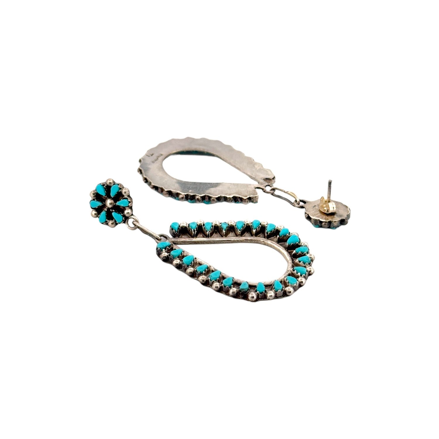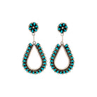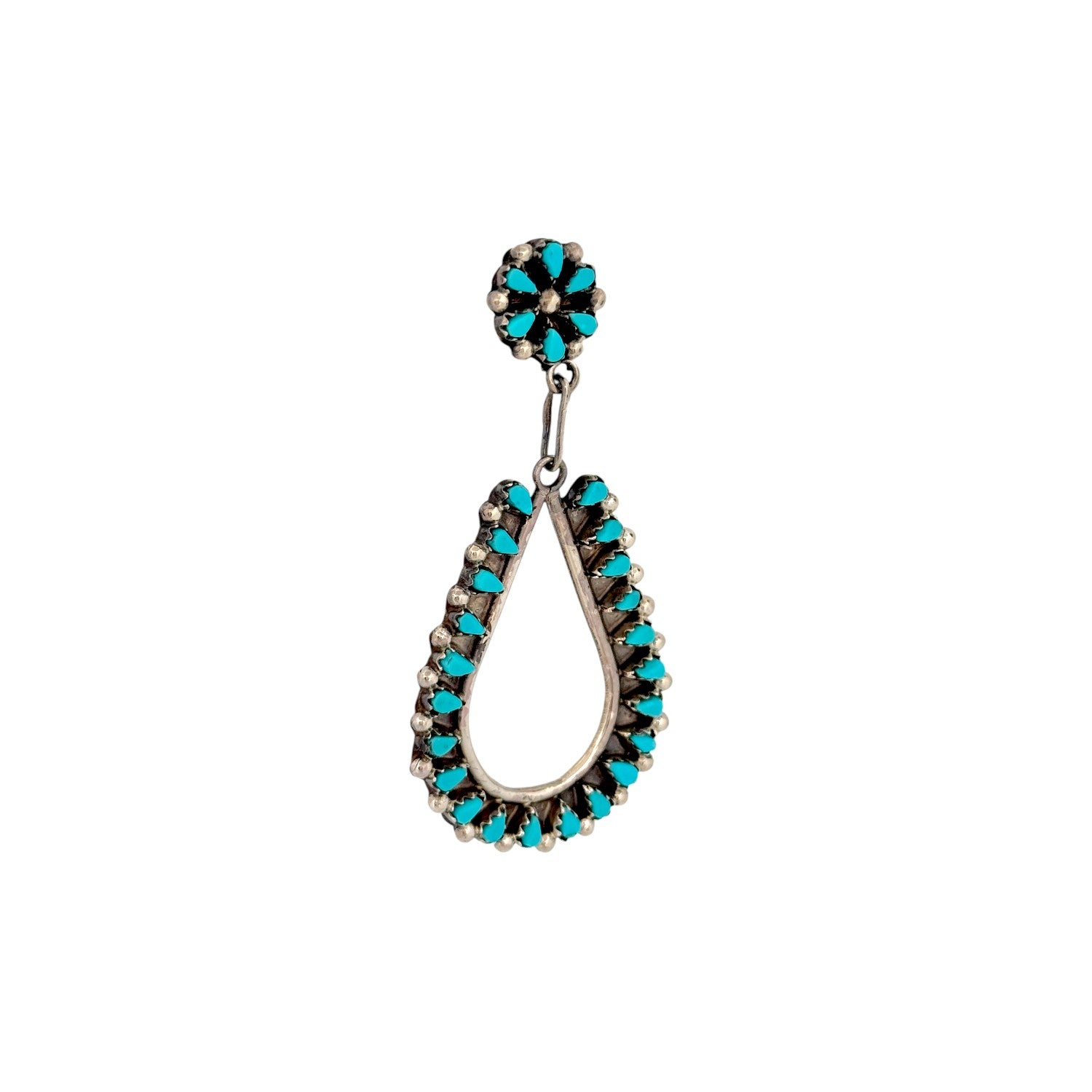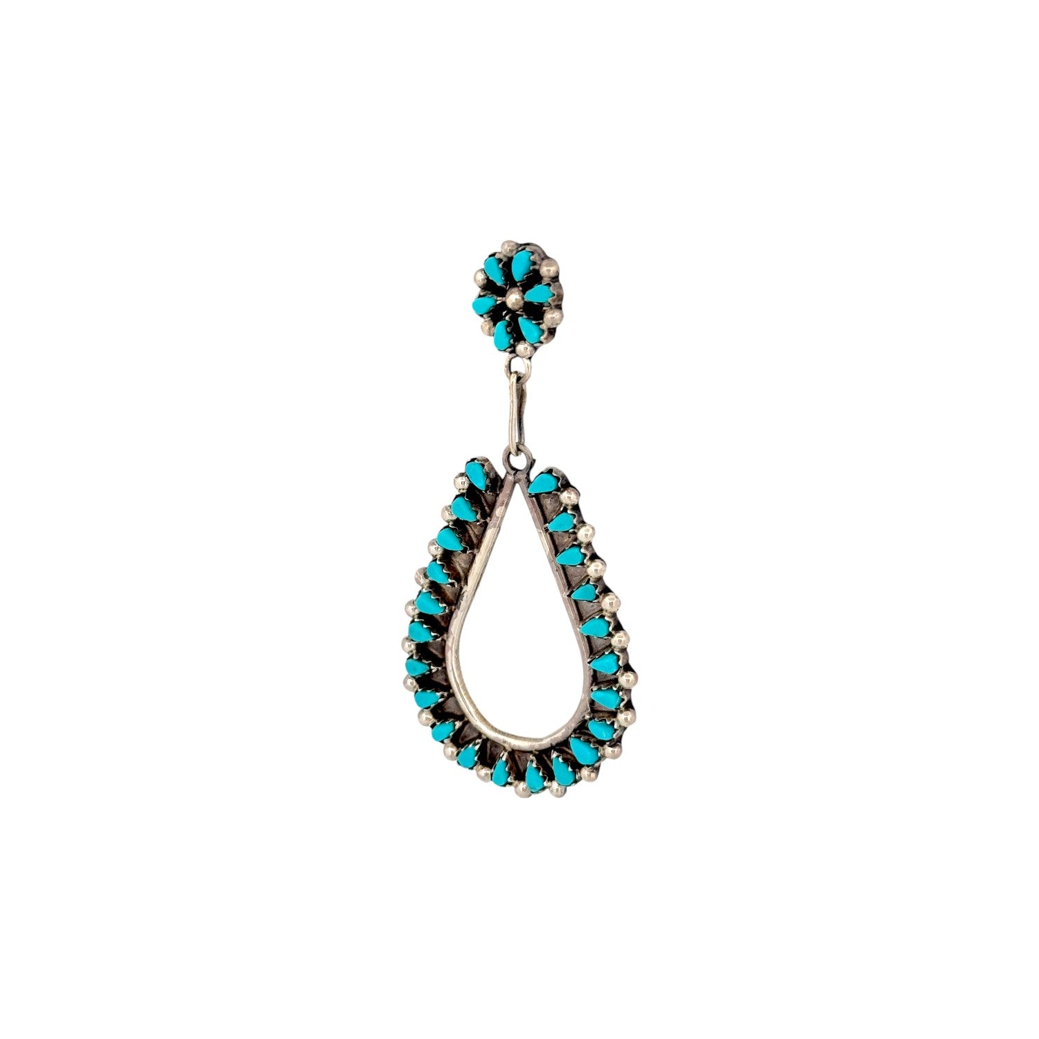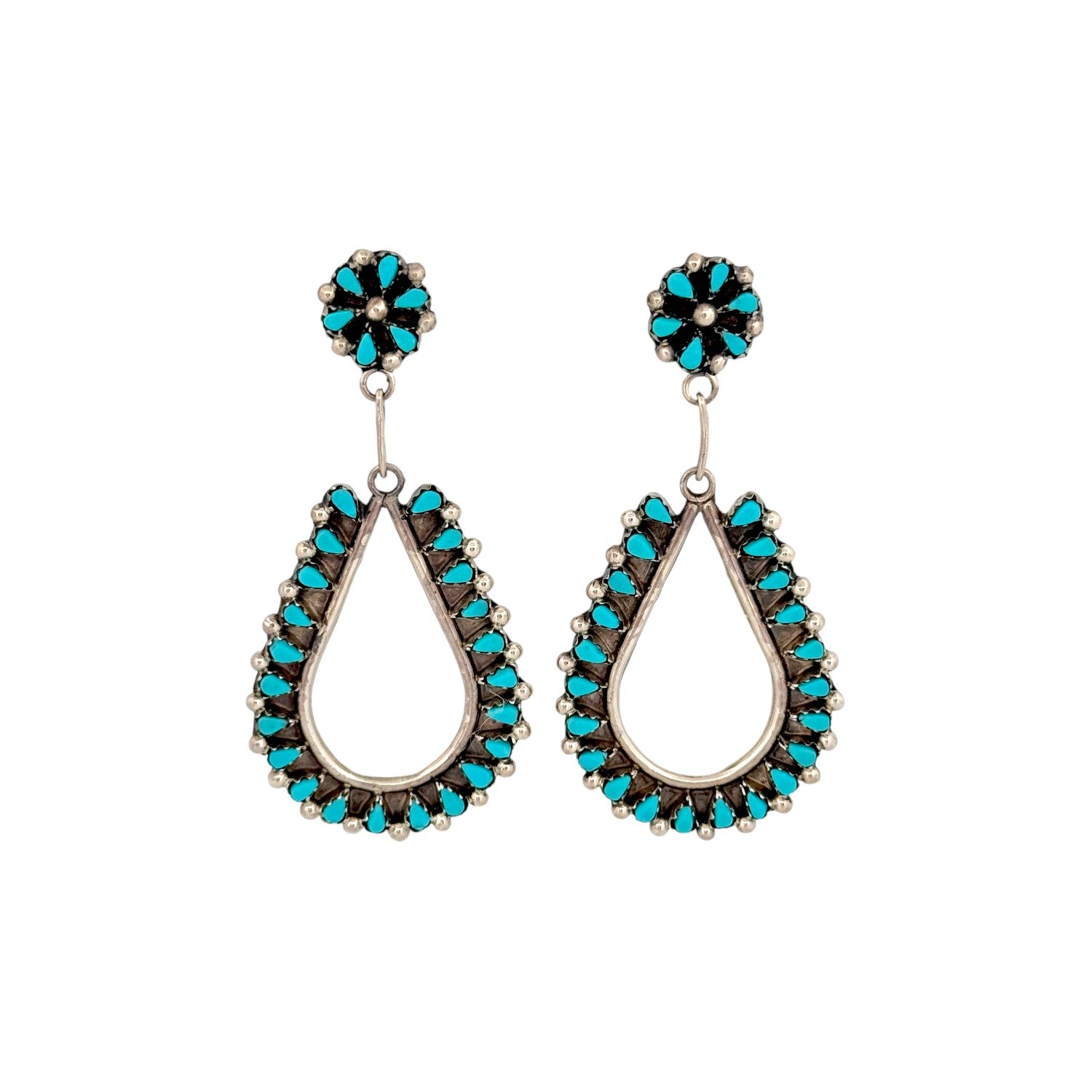 These Zuni handmade earrings by Tricia Leekity feature radiant Sleeping Beauty turquoise set in sterling silver. The design pairs delicate floral cluster studs with elegant open teardrop dangles, each lined with petite turquoise stones. The vibrant sky-blue hue of the Sleeping Beauty turquoise contrasts beautifully against the darkened silver background. Fine beadwork and precise stone placement highlight the artist’s meticulous craftsmanship and eye for symmetry. Graceful and eye-catching, these earrings embody timeless Zuni artistry with a fresh, feminine silhouette.