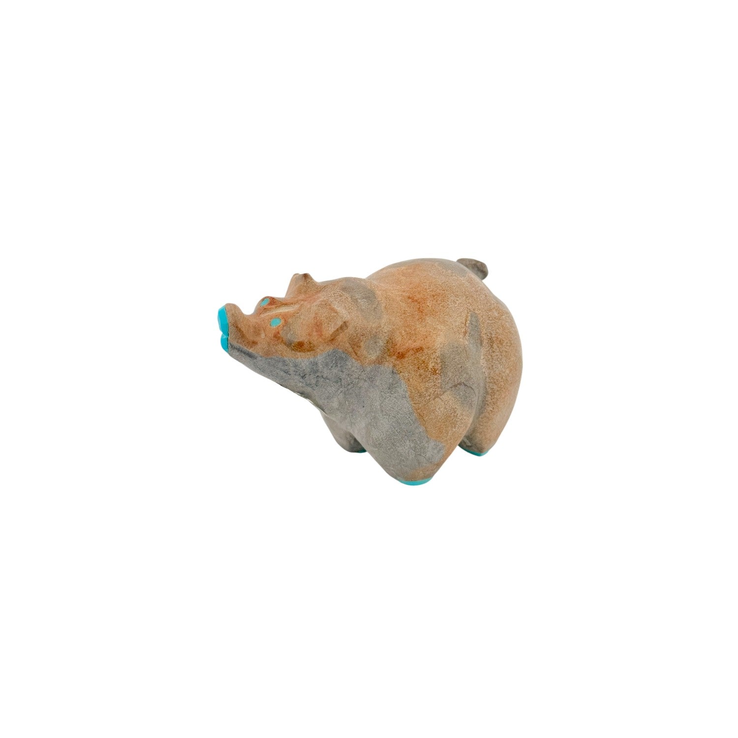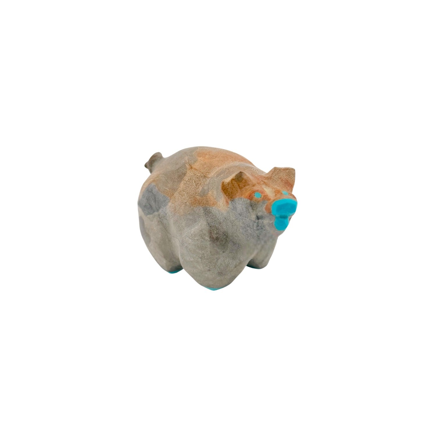 This Zuni hand-carved Pig Fetish by Freddie Leekya is sculpted from warm-toned travertine, showcasing soft layers of earthy beige and gentle gray hues. The rounded, contented form captures the pig’s playful and grounded nature, with smooth contours that highlight the stone’s natural character. Inlaid Sleeping Beauty Turquoise accents at the eyes, snout, and hooves provide a vibrant contrast against the muted travertine surface. The careful polish and balanced proportions reflect Leekya’s skilled craftsmanship and eye for detail. Symbolizing abundance, prosperity, and good fortune, this charming pig is a delightful example of traditional Zuni carving artistry.