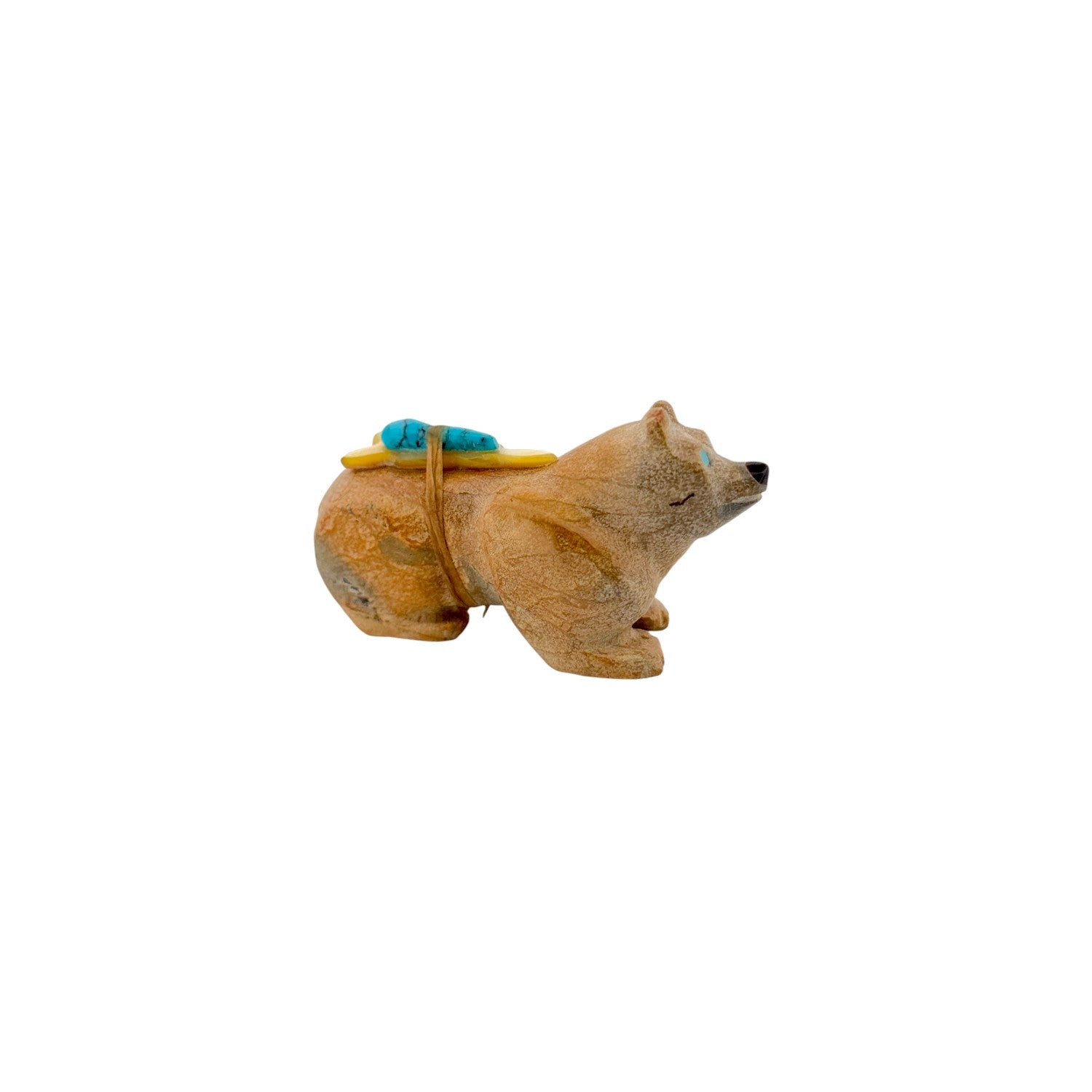 This Zuni hand-carved Bear Fetish by Freddie Leekya is sculpted from warm, earthy travertine, highlighting the natural textures and subtle variations of the stone. The bear’s compact, grounded stance reflects strength, protection, and healing power within Zuni tradition. A finely crafted medicine bundle rests along its back, featuring yellow shell and vibrant accents of Sleeping Beauty Turquoise and Kingman Turquoise. The bright stones create a striking contrast against the soft tan travertine, adding depth and visual balance to the piece. Thoughtfully detailed and expertly polished, this handcrafted fetish is a beautiful example of traditional Zuni artistry and meaningful design.