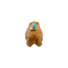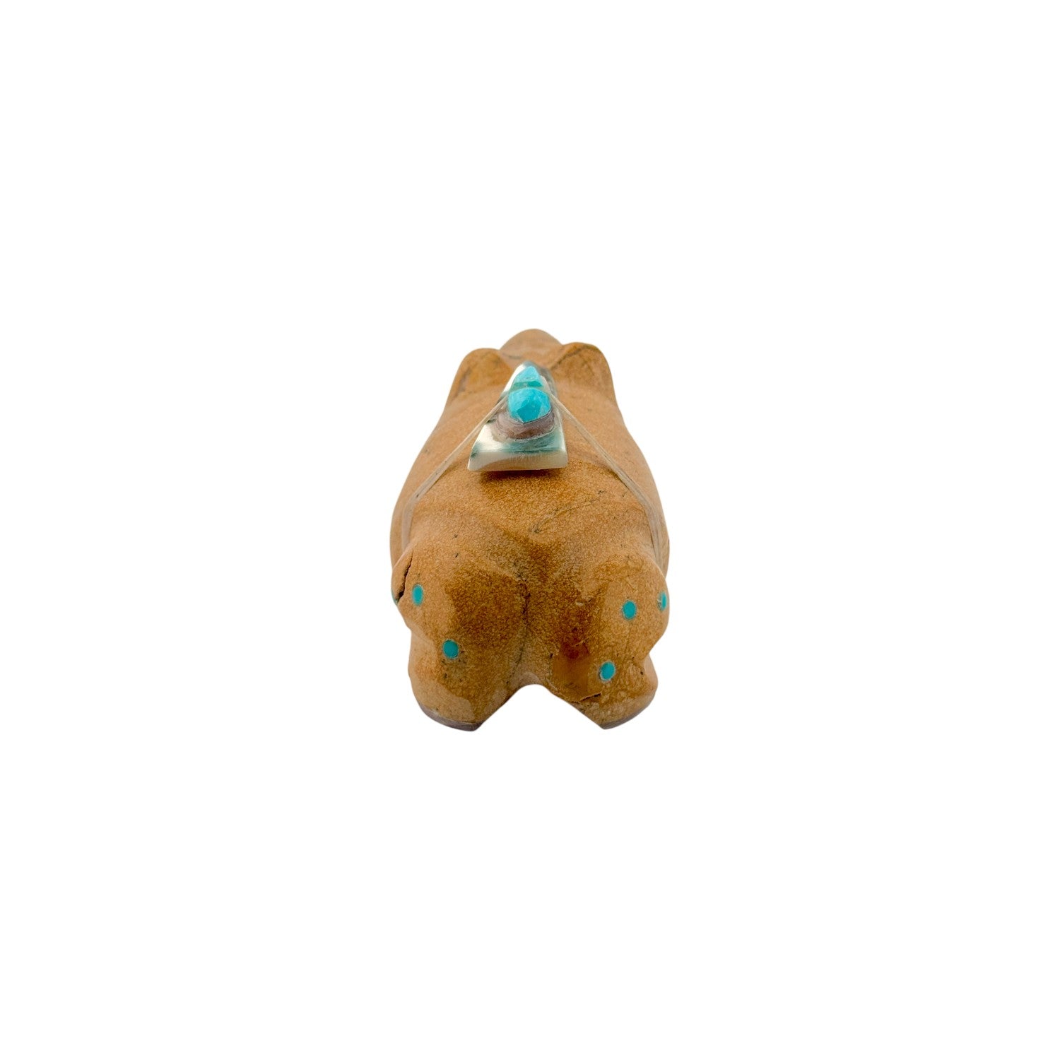 This Zuni hand-carved Frog Fetish by Freddie Leekya is sculpted from warm, earthy travertine, its natural texture enhancing the rounded, lifelike form. The frog, a symbol of cleansing, renewal, and abundance in Zuni tradition, is brought to life with inlaid Sleeping Beauty Turquoise and Kingman Turquoise accents that add vibrant touches of blue. Subtle jet inlay provides contrast, while a delicately arranged bundle of abalone shell and pink shell rests along the back, secured with natural sinew. The interplay of stones and shell creates a harmonious balance of color against the soft tan hues of the travertine. Expertly carved and thoughtfully detailed, this piece reflects Leekya’s masterful craftsmanship and the enduring beauty of Zuni hand-carved fetish artistry.