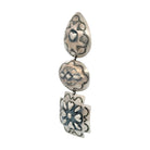 These beautiful Navajo handmade earrings by Rita Lee exemplify her distinctive mastery of sterling silver stamp work and design. Each earring features three linked panels; teardrop, oval, and square each individually hand-stamped with intricate traditional patterns and repoussé accents. The motifs include hearts, florals, and geometric designs, symbolizing love, life, and balance in Navajo culture. The oxidized background enhances the depth of the raised silverwork, giving the earrings a rich, vintage patina. Despite their bold appearance, they are thoughtfully balanced for comfortable wear and graceful movement.