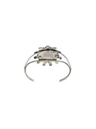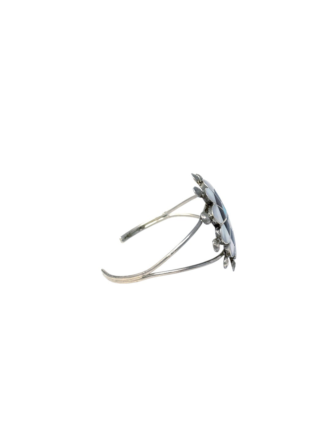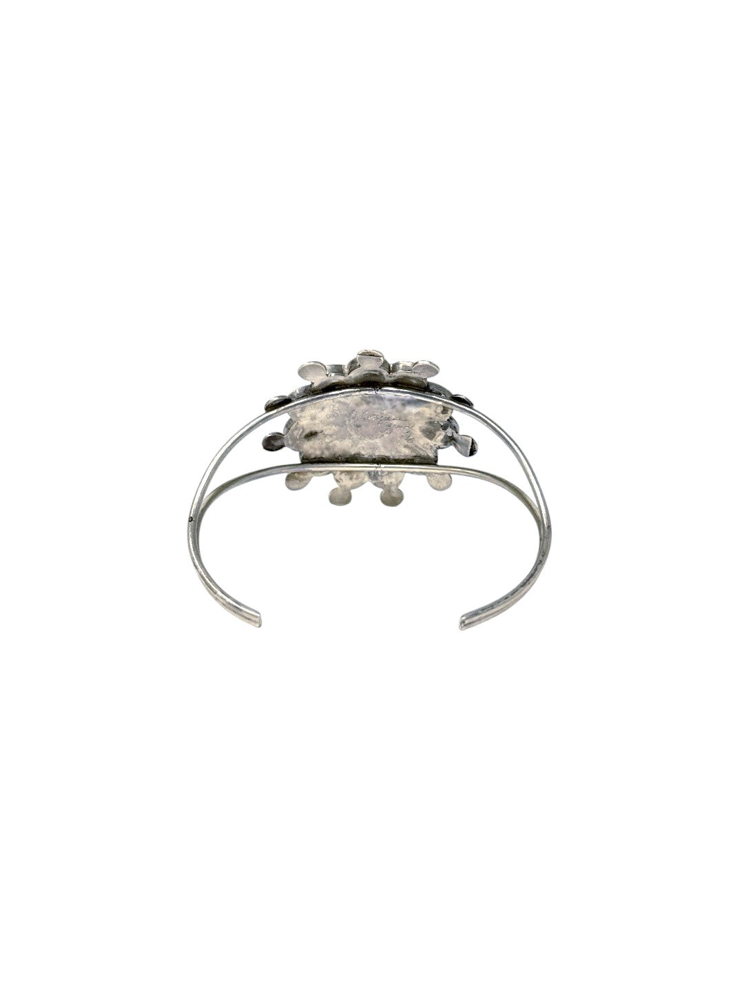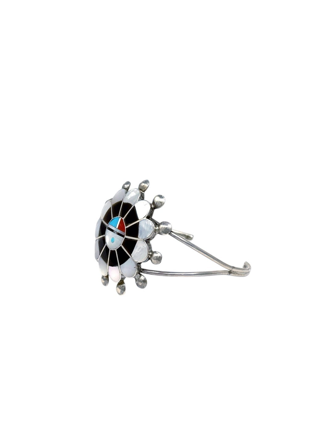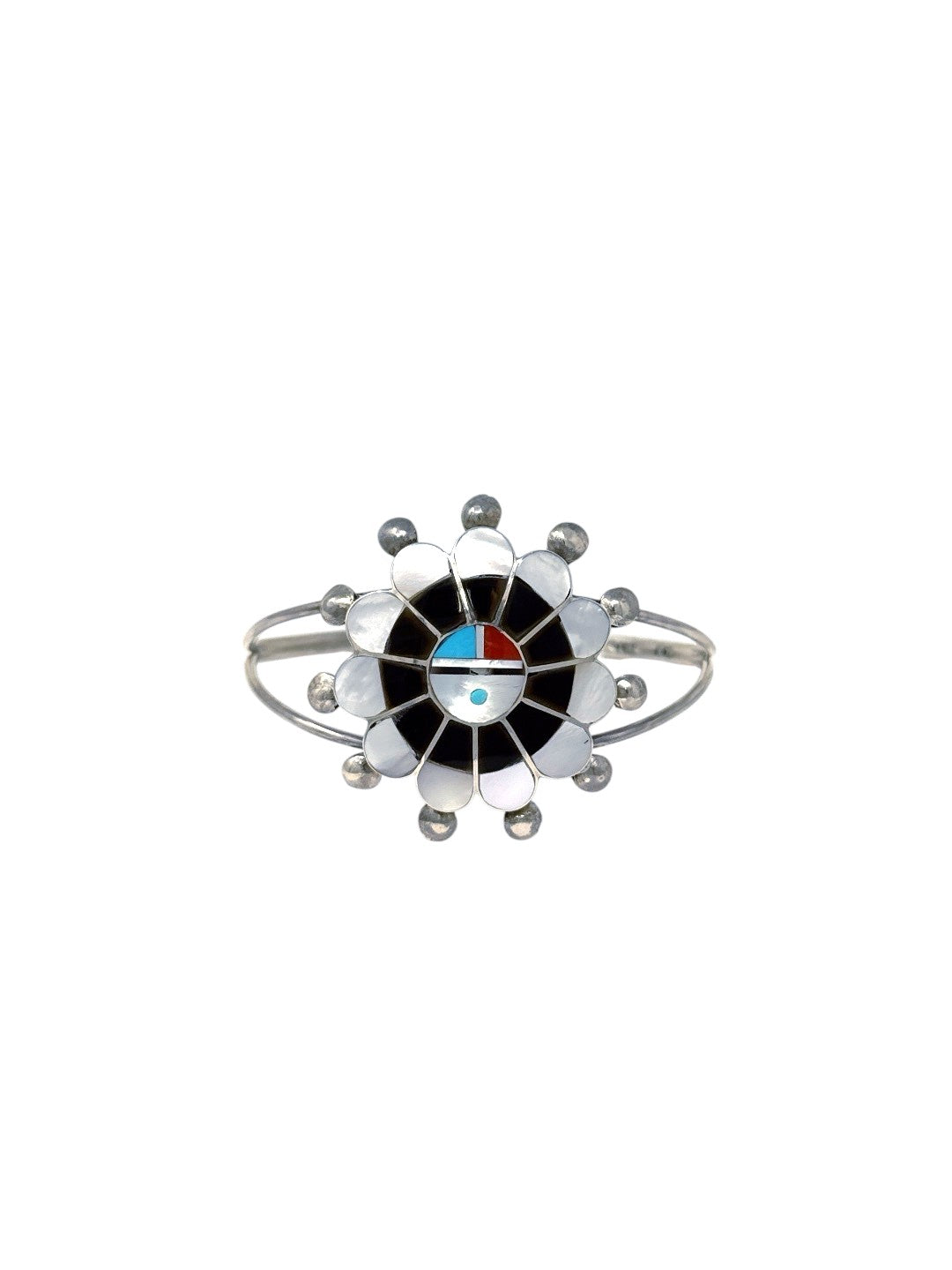 This radiant bracelet by Pauline Lonjose, a highly regarded Zuni artisan, is a stunning expression of cultural symbolism and craftsmanship. Expertly handcrafted from sterling silver, the piece features a beautifully inlaid Zuni Sunface, created using turquoise, coral, abalone, and mother of pearl. Representing harmony, balance, and the sacred sun, the Sunface sits at the heart of a floral-inspired setting with a delicate border of silver drops. The polished split band adds comfort and elegance, allowing the central motif to shine. Lonjose's precise stonework and artistic vision are rooted in generations of Zuni tradition, making each piece a tribute to identity and spirit.