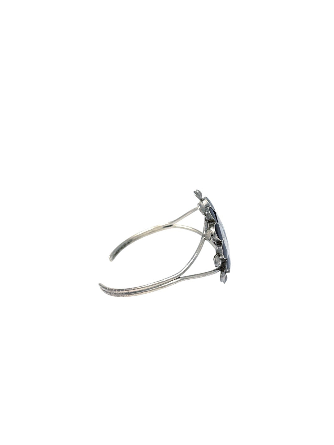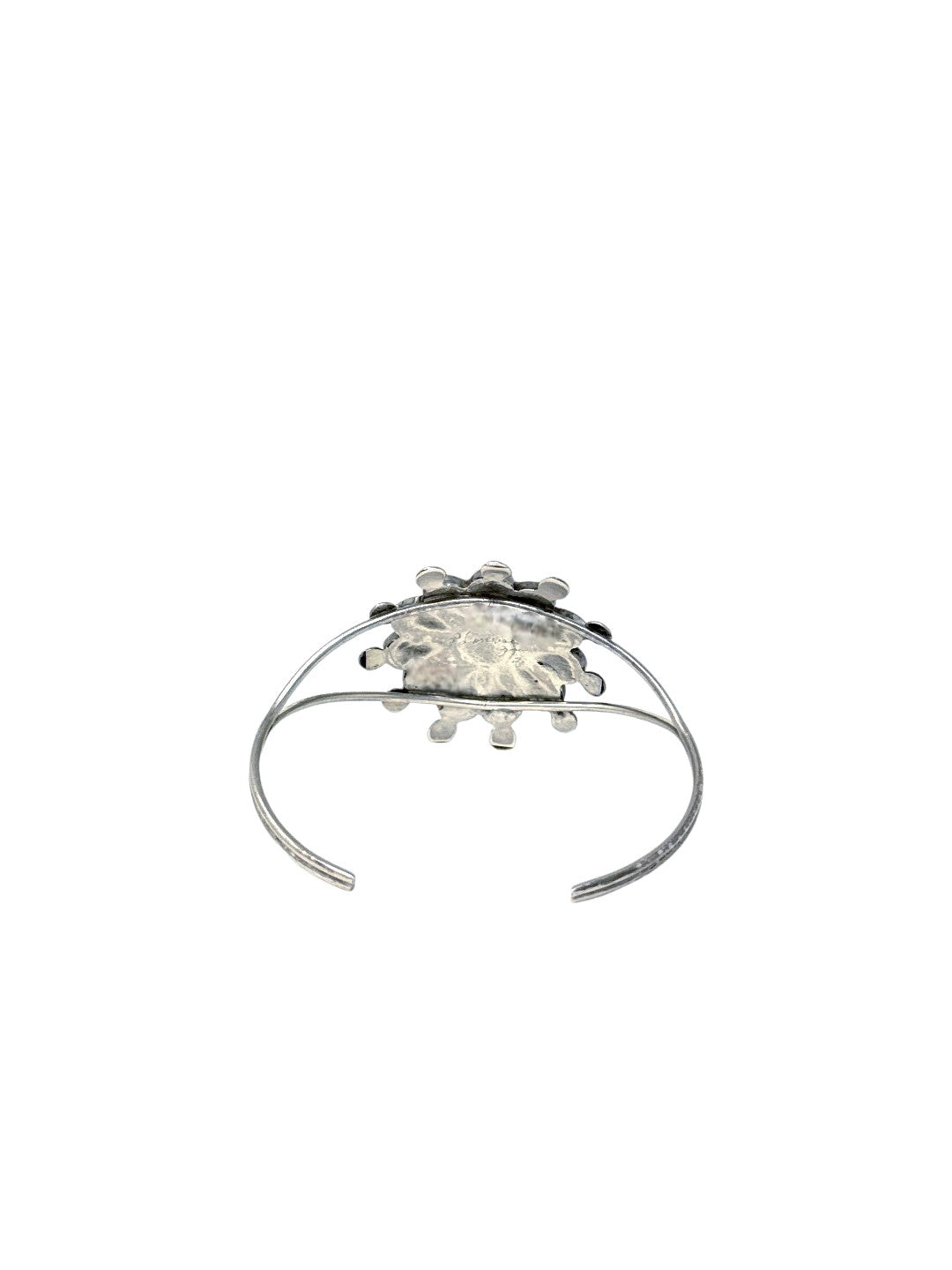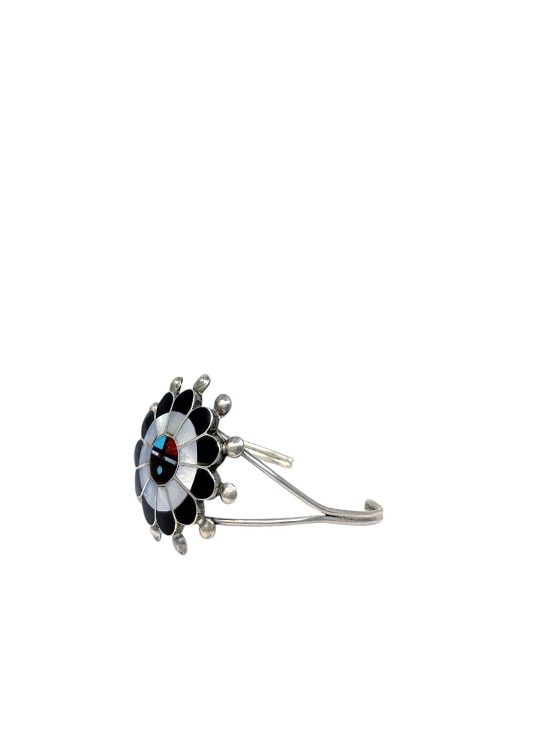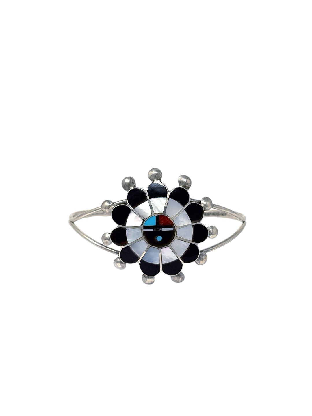 This radiant bracelet by Pauline Lonjose, a highly regarded Zuni artisan, is a stunning expression of cultural symbolism and craftsmanship. Expertly handcrafted from sterling silver, the piece features a beautifully inlaid Zuni Sunface, created using turquoise, coral, abalone, and mother of pearl. Representing harmony, balance, and the sacred sun, the Sunface sits at the heart of a floral-inspired setting with a delicate border of silver drops. The polished split band adds comfort and elegance, allowing the central motif to shine. Lonjose's precise stonework and artistic vision are rooted in generations of Zuni tradition, making each piece a tribute to identity and spirit.