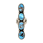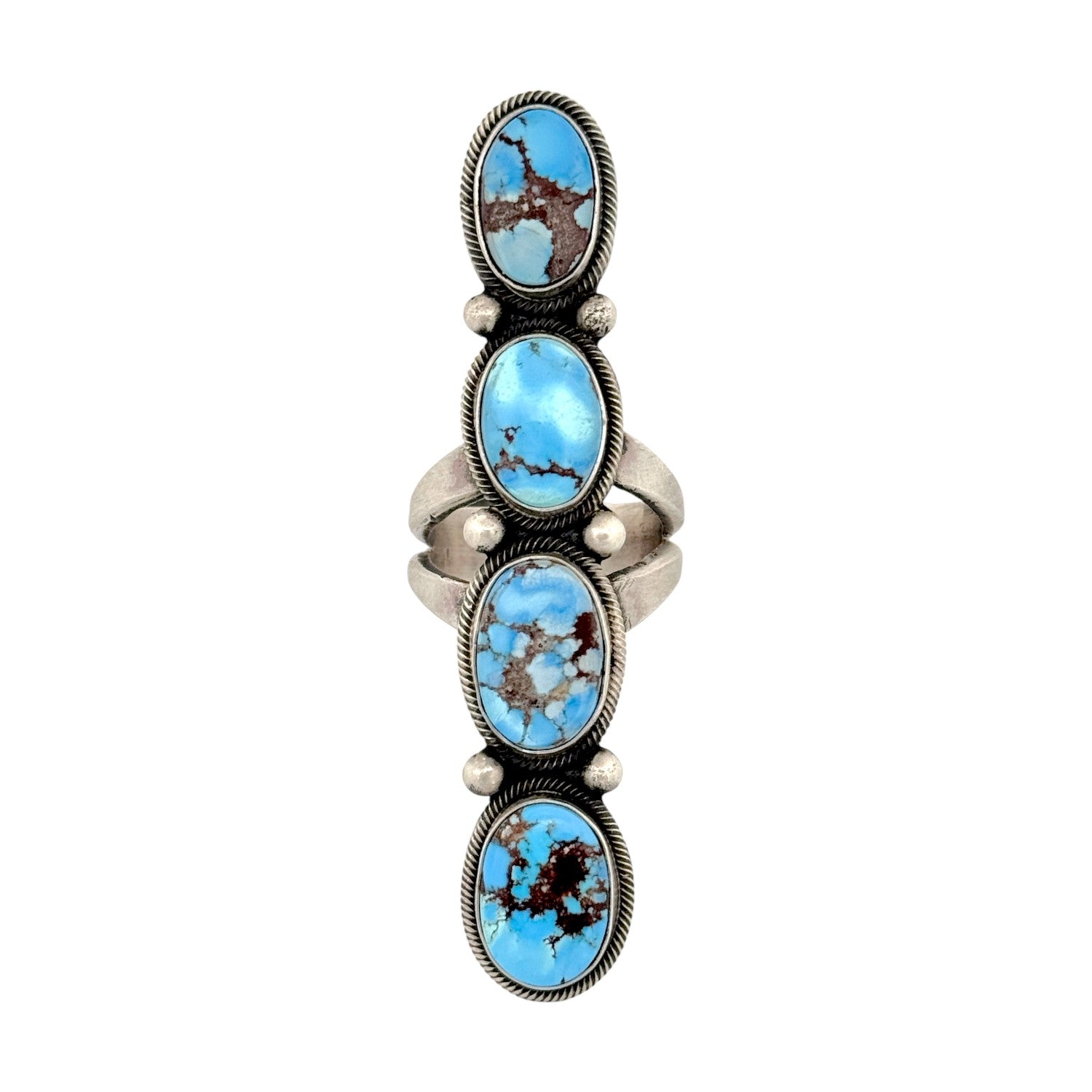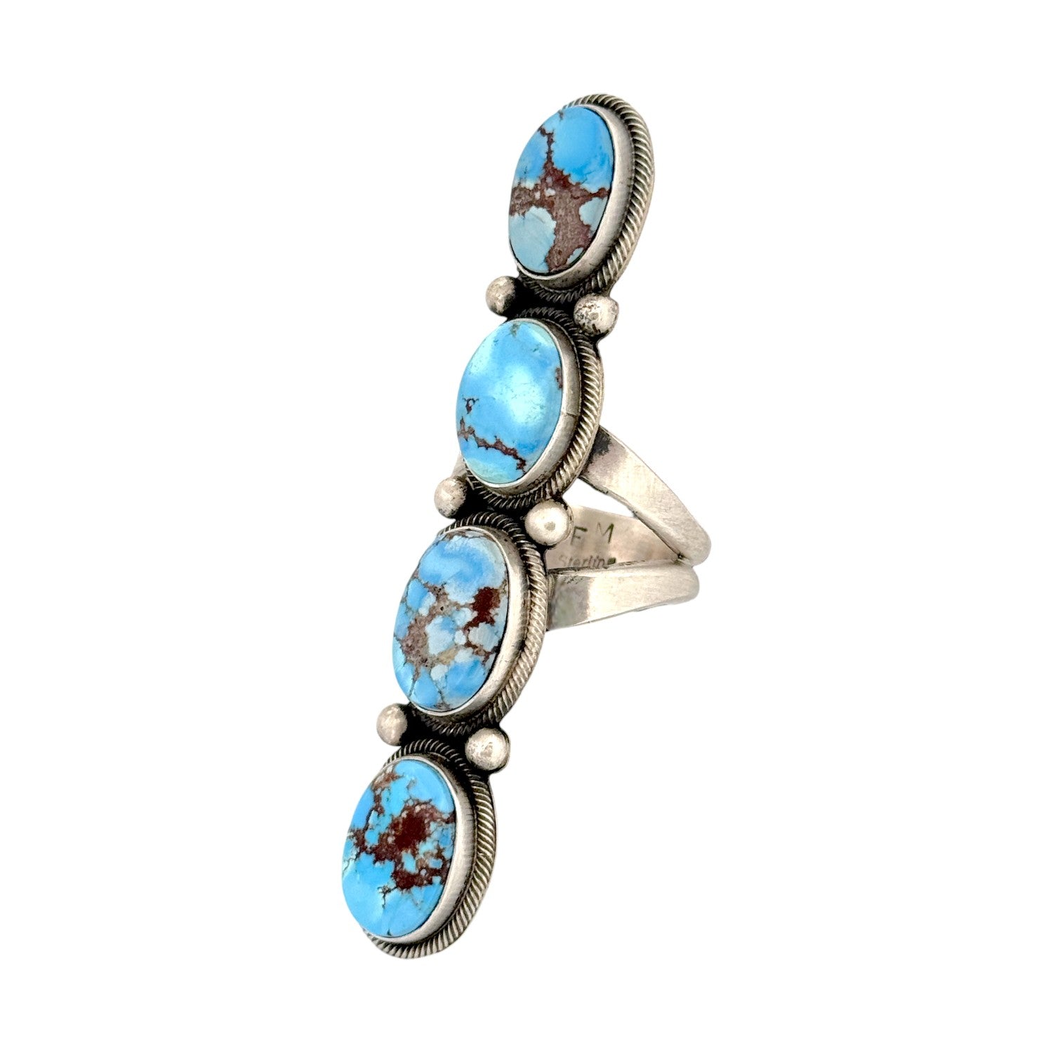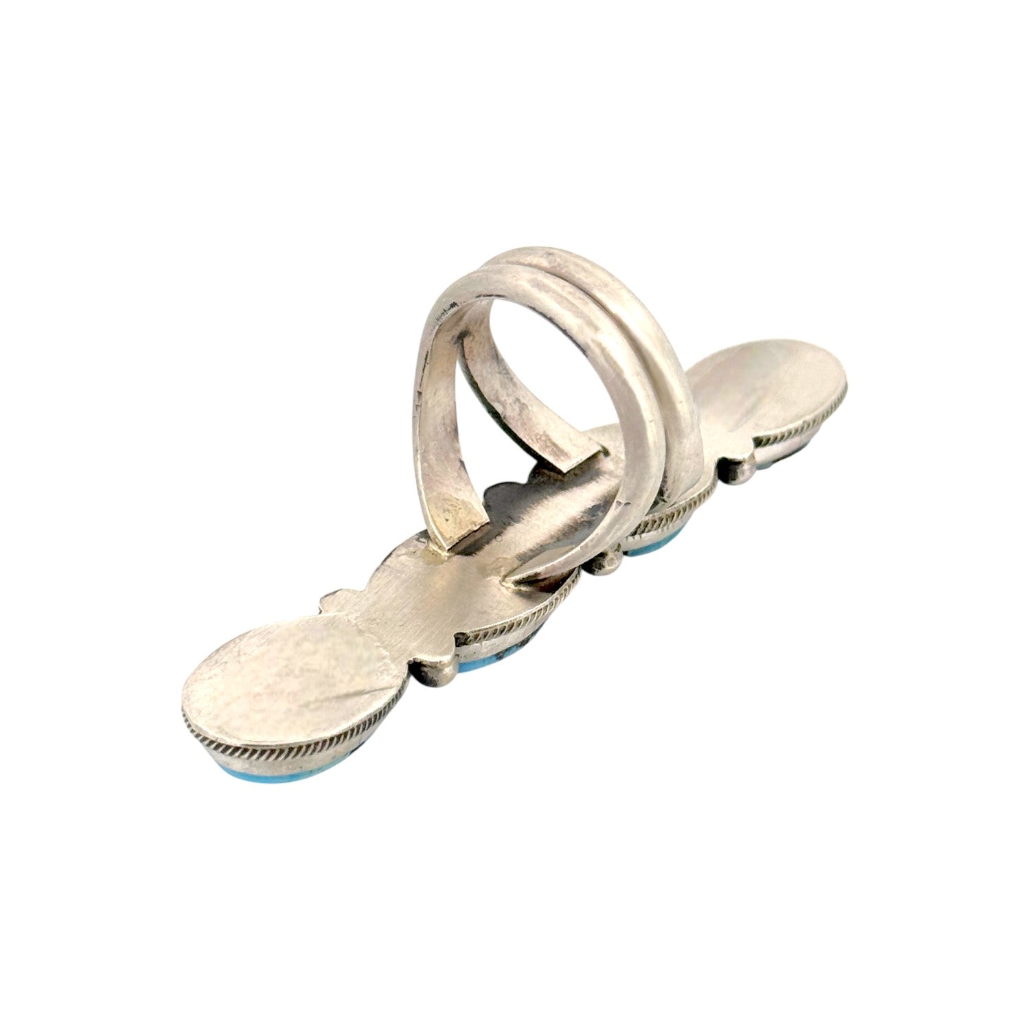 This exquisite ring by Navajo artist Freddie Maloney features three beautifully matched Golden Hills Turquoise stones, each with its signature sky-blue hue and striking brown matrix. Set vertically in sterling silver, the stones create a balanced and elegant design that draws the eye along the hand. Each turquoise cabochon is framed with a delicate twisted silver border and accented by polished beads, a hallmark of traditional Navajo silversmithing. The craftsmanship is both bold and refined, showcasing Maloney’s skill in highlighting the natural beauty of the stone. The soft glow of the silver complements the cool blue tones, creating a timeless Southwestern aesthetic.