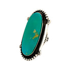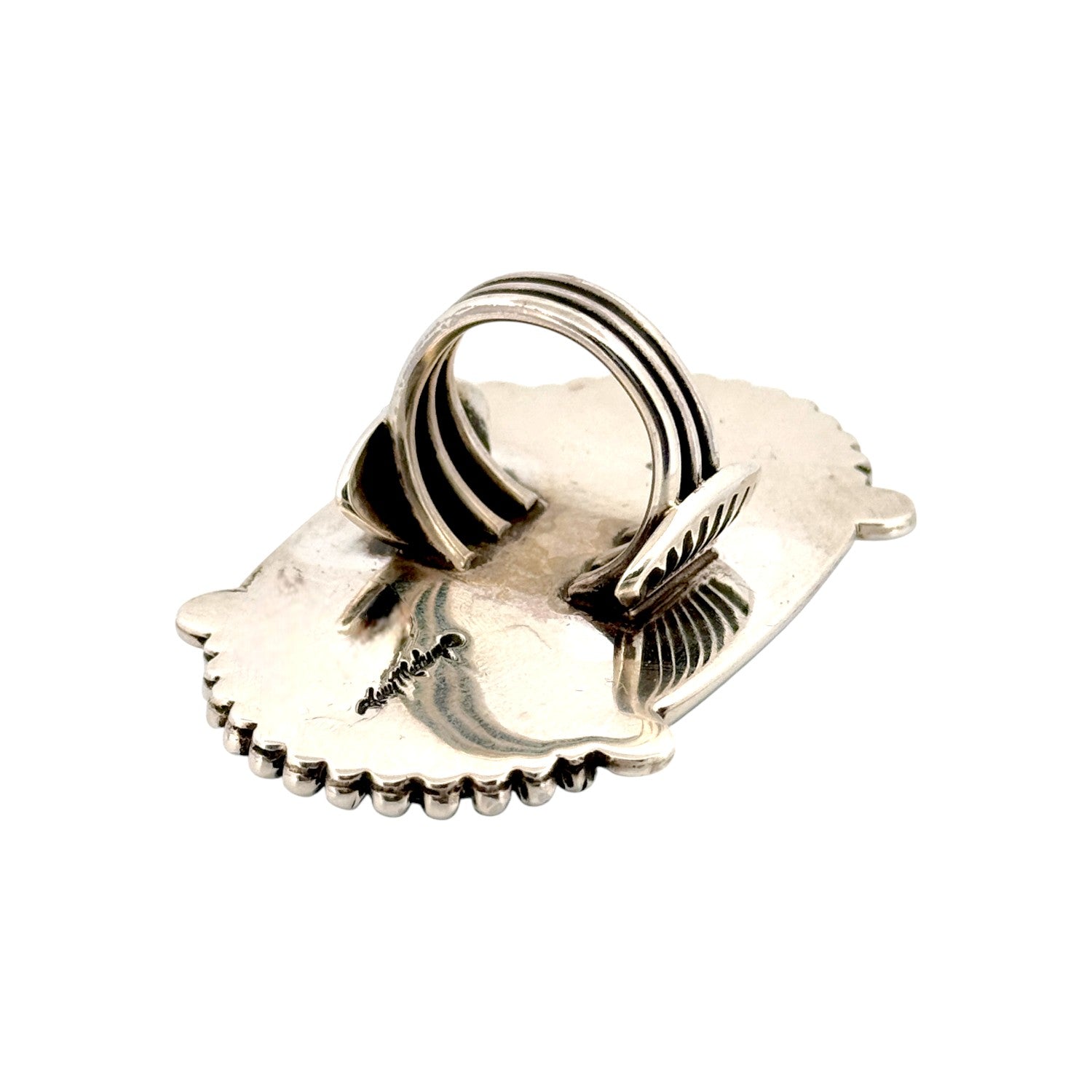 This elegant ring by Navajo silversmith Larry Martinez features a stunning Fox Turquoise stone, admired for its serene blue-green hue and subtle golden matrix. The elongated oval stone is set in a smooth sterling silver bezel, framed with fine hand-stamped details and delicate beadwork that highlight its natural beauty. Martinez incorporates graceful silver scrolls at the top and bottom, adding a touch of sophistication and balance to the bold centerpiece. The craftsmanship reflects traditional Navajo techniques passed down through generations, honoring both skill and heritage. Each element, from the polished finish to the refined setting, speaks to Martinez’s precision and artistry.
