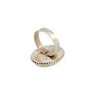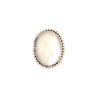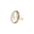 This elegant ring by Navajo artist Benjamin Martinez features the soft iridescence of Mother of Pearl, beautifully set in a polished sterling silver frame. The oval gemstone shimmers with subtle hues of white and cream, reflecting light with a natural luster reminiscent of moonlight. Surrounding the stone is a border of delicate silver beads, adding texture and refinement to the design. The craftsmanship showcases Martinez’s mastery of traditional Navajo silversmithing; simple, balanced, and timelessly graceful. Lightweight yet eye-catching, this ring captures the essence of understated elegance and natural beauty.