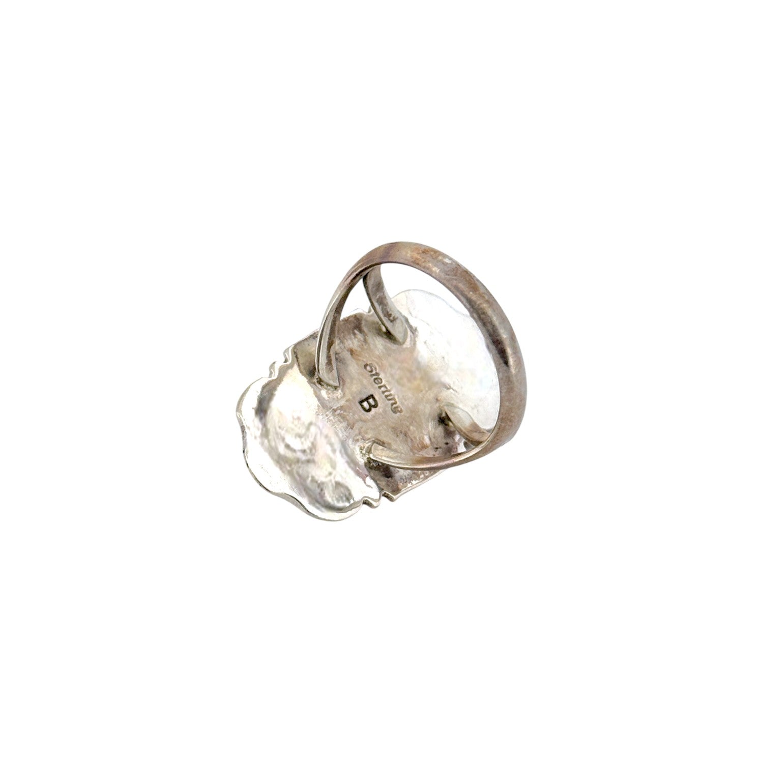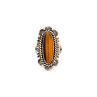 Crafted by Navajo silversmith Benjamin Martinez, this striking ring showcases a radiant Tiger’s Eye gemstone, glowing with golden-brown tones that shift beautifully in the light. The elongated oval stone is set in a hand-forged sterling silver bezel, framed by a twisted rope border and intricate stamp work that highlight traditional Navajo artistry. Each silver element; from the scalloped edges to the detailed engraving, enhances the ring’s timeless Southwestern charm. The Tiger’s Eye, known for its grounding and protective energy, adds both beauty and meaning to this handmade piece. Martinez’s craftsmanship shines through in the balance of design and material, creating a ring that feels both powerful and refined.