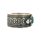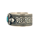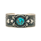This bracelet by master silversmith Calvin Martinez is a stunning example of Navajo handmade craftsmanship, blending traditional design with exceptional detail. The centerpiece features a beautiful Waterweb Kingman Turquoise stone, showcasing a vivid blue hue with rich brown matrix patterns that evoke the natural beauty of the Southwest. The stone is framed by an intricately hand-stamped sterling silver cuff, adorned with radiating patterns, heart motifs, and raised conchos that give the piece a bold, dimensional character. Martinez’s hallmark antique finish adds depth and texture, highlighting the precision of each engraved element.
