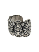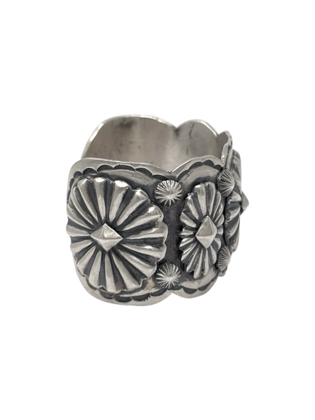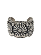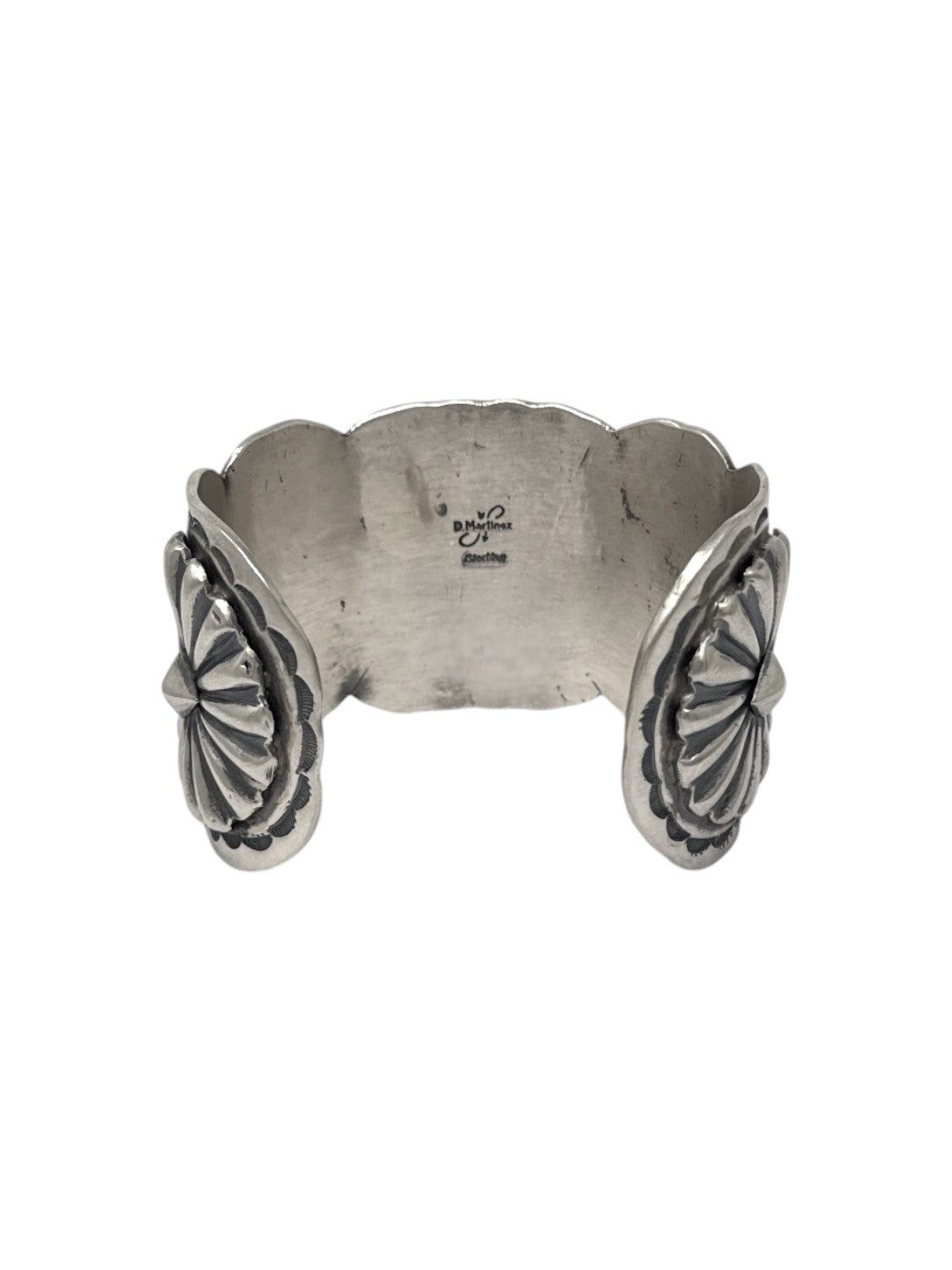 This striking bracelet by Dexter Martinez, a skilled Navajo silversmith, is a bold celebration of texture, tradition, and form. Handcrafted from sterling silver, the wide band features deep repoussé and stamp work, forming a powerful pattern of radiating sunbursts and geometric motifs. The raised designs are set against a darkened, oxidized background, creating dramatic contrast and visual depth. Scalloped edges and precise silverwork add elegance to its rugged strength, making it both refined and commanding. Known for his mastery of traditional Navajo silversmithing techniques, Martinez brings a rich cultural narrative to each piece. This bracelet is a timeless example of Native American artistry, perfect for collectors who value heritage, craftsmanship, and bold design.