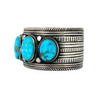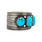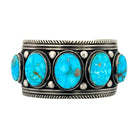 This impressive bracelet by master silversmith Calvin Martinez showcases the timeless beauty of Navajo handmade jewelry. Featuring striking Waterweb Kingman turquoise stones, each cabochon displays vivid sky-blue hues interlaced with intricate brown and gray matrix patterns. The stones are set in finely crafted sterling silver bezels, framed by twisted wire and accented with bold silver drops for added dimension. The cuff’s substantial design is enhanced by detailed stamp work along the borders, demonstrating Martinez’s signature blend of strength and elegance. The oxidized finish highlights the intricate textures, giving the piece a rich, vintage character. Perfectly balanced in form and color, this bracelet captures the spirit of traditional Navajo artistry with a refined contemporary touch.