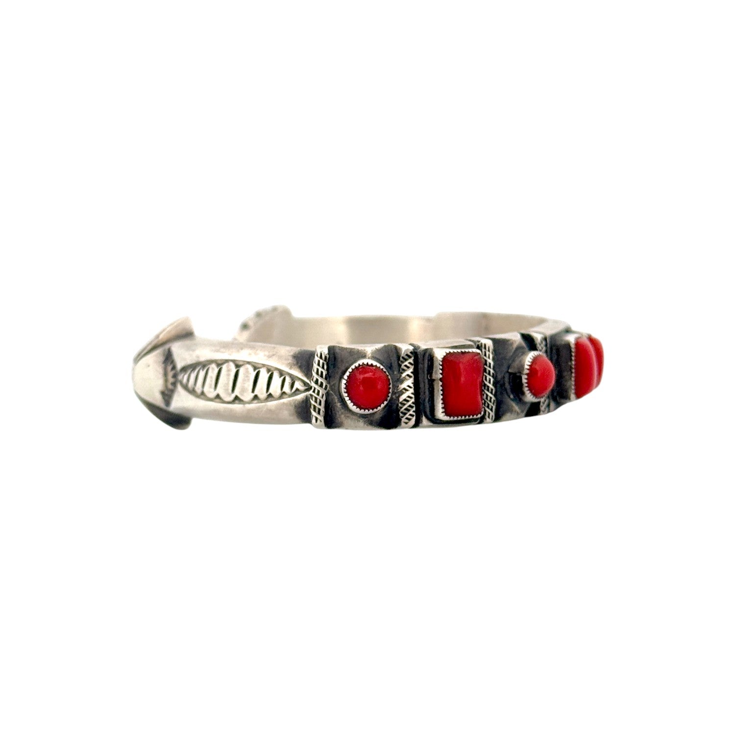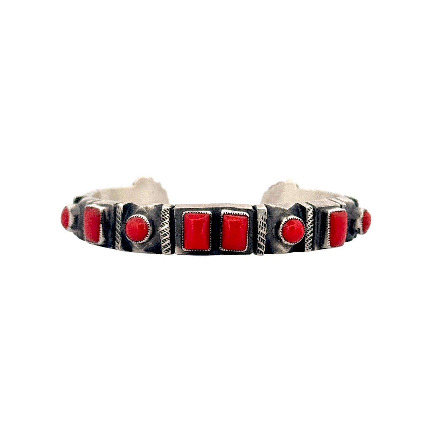 This striking bracelet by Navajo silversmith Calvin Martinez showcases his signature vintage-inspired craftsmanship, featuring rich Mediterranean coral set in sterling silver. The alternating round and rectangular coral stones are meticulously placed in hand-cut bezels, bordered with fine stamp work and oxidized silver for depth and contrast. Each coral piece glows with a deep red hue, symbolizing strength and vitality in Navajo tradition. The bracelet’s sturdy construction and balanced design reflect Martinez’s mastery of traditional techniques, honoring the styles of mid-20th-century Navajo jewelry.
