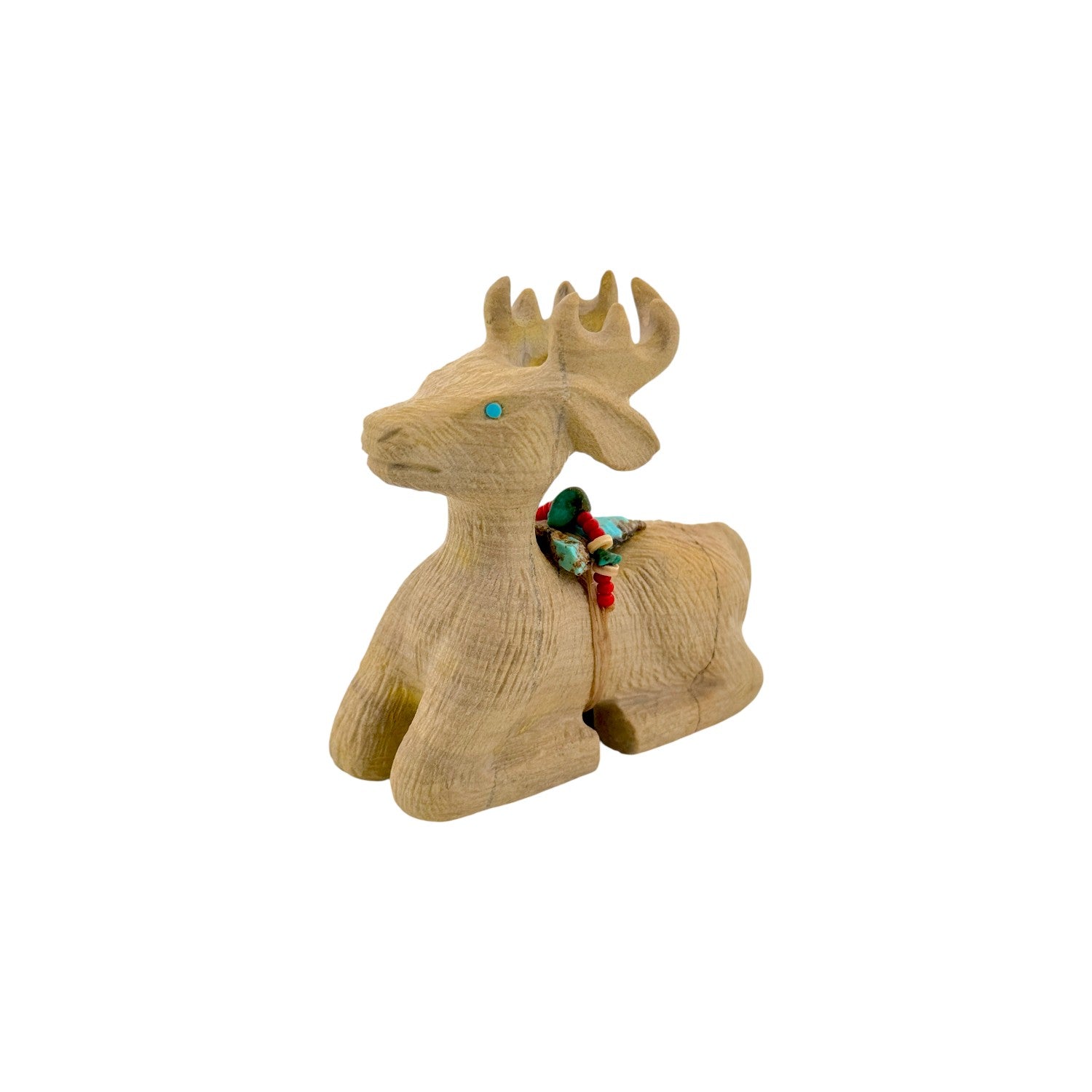 This Zuni hand-carved Deer Fetish by Douglas Martza is sculpted from warm, natural sandstone, capturing the gentle spirit and quiet strength of the animal. The deer rests in a peaceful pose, symbolizing harmony, sensitivity, and a deep connection to nature within Zuni tradition. Accented with Sleeping Beauty Turquoise and Kingman Turquoise, the vibrant stones add striking contrast and spiritual significance to the piece. The turquoise inlay and detailed carving reflect skilled craftsmanship and an eye for balance, proportion, and sacred symbolism. This handcrafted fetish is both a meaningful cultural expression and a beautiful collector’s piece rooted in authentic Zuni artistry.