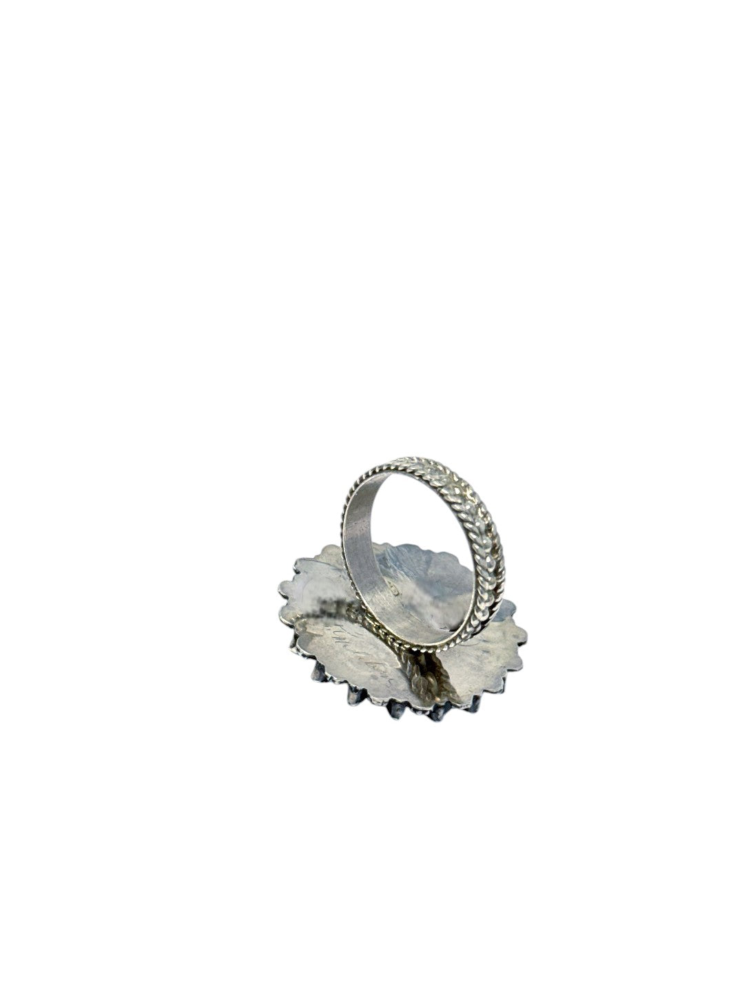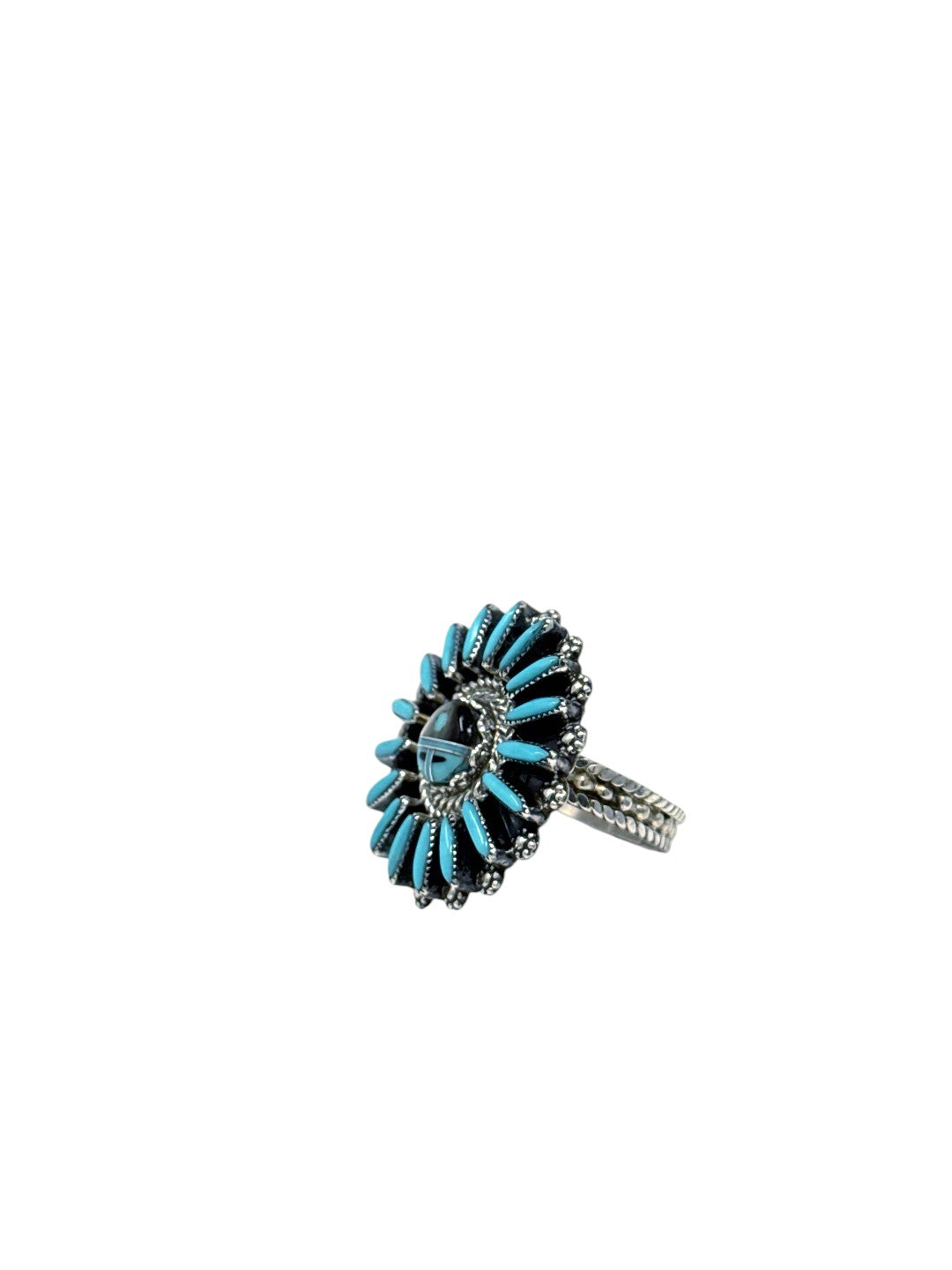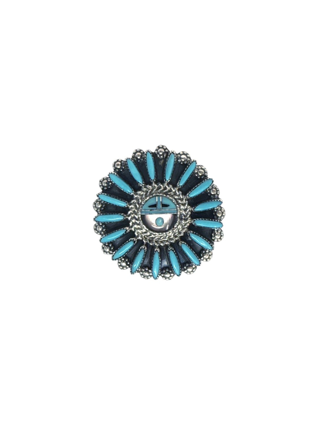 This stunning ring by Harry Melikan, a respected Zuni artisan, is a radiant tribute to traditional stonework and sacred symbolism. Handcrafted from sterling silver, the ring features a bold Sunface design at its center, inlaid with turquoise, jet, and abalone. Bringing together stones representing harmony, life, and spiritual balance in the Zuni culture. Surrounding the Sunface is a burst of hand-cut turquoise needlepoint stones, arranged in a perfect floral circle that radiates light and movement. The precision and care in each setting reflect Melikan’s masterful skill and deep cultural connection. Finished with fine silver beading and a polished band, this ring blends visual impact with spiritual meaning. A striking and collectible piece of wearable art for the discerning admirer of Native American craftsmanship.