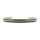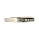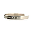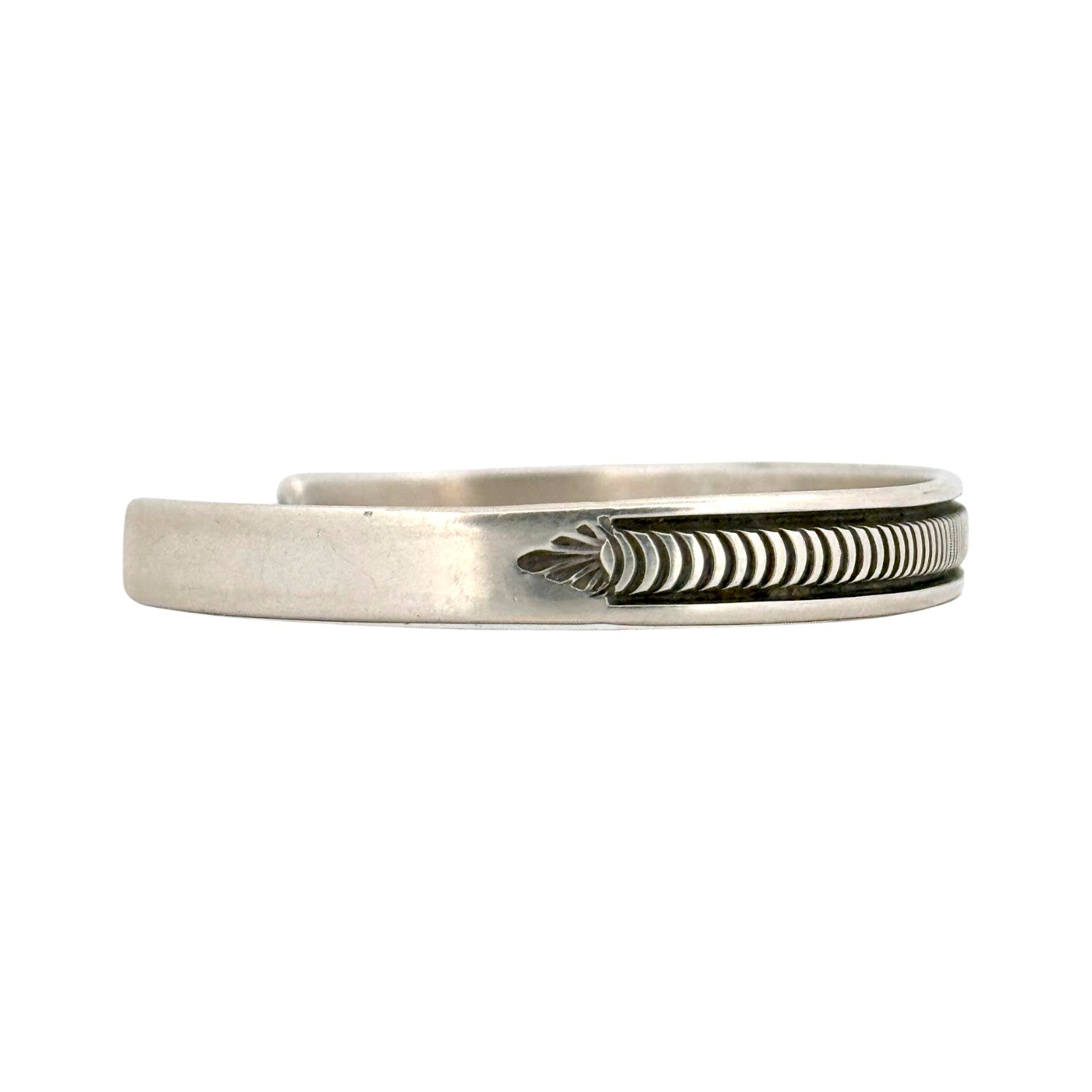 This vintage Navajo bracelet by Bruce Morgan, crafted circa the 2000s, showcases the refined artistry for which he is renowned. Hand-forged from sterling silver, the cuff features a meticulously stamped linear design, balancing modern elegance with traditional Navajo motifs. The repeating crescent stamp work adds texture and rhythm, while the oxidized background enhances the sharp detail of the silver impressions. Known for his clean, precise stamp work and understated sophistication, Morgan’s pieces bridge the gap between contemporary wearability and cultural heritage. This bracelet is both versatile and timeless, easily worn alone or layered with other pieces.