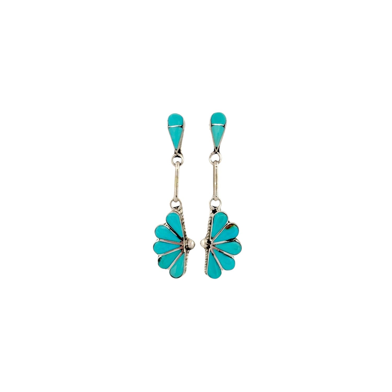 These elegant Zuni Handmade earrings by Velda Nastacio feature vibrant Sleeping Beauty Turquoise set in finely crafted sterling silver. The turquoise stones display the bright, sky-blue color that makes Sleeping Beauty Turquoise highly prized. Arranged in a graceful fan design, the stones create a delicate pattern that reflects traditional Zuni inlay and cluster artistry. The elongated drop style adds movement and elegance while highlighting the careful stonework and polished silver details. These earrings are a beautiful example of Zuni craftsmanship, blending vivid turquoise with refined handmade silverwork.
