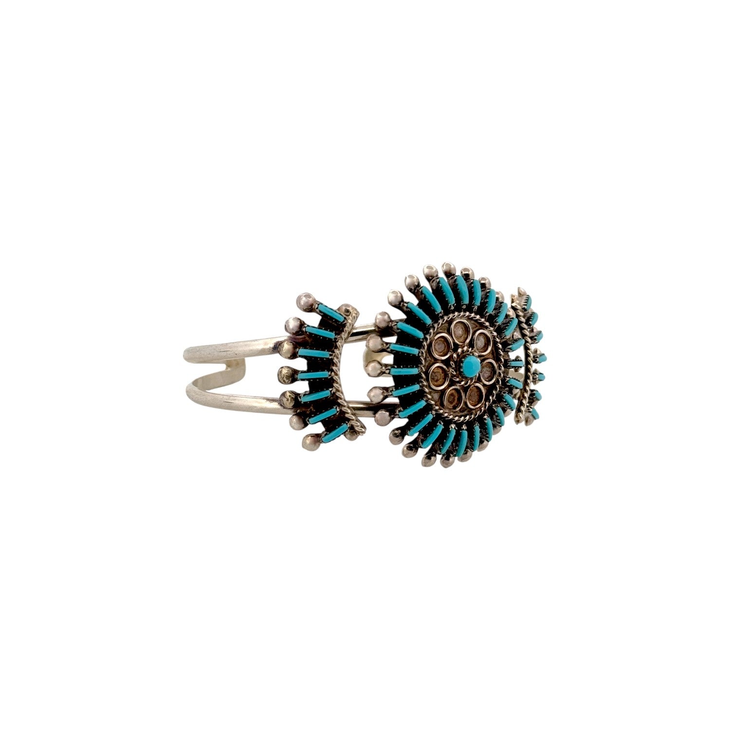This vintage bracelet by Pitkin Natewa is a stunning example of traditional Zuni craftsmanship in sterling silver. The design features vibrant Sleeping Beauty Turquoise stones arranged in intricate needlepoint and cluster formations, creating a bold yet refined sunburst effect. Delicate silver rope accents and carefully placed silver drops enhance the depth and dimension of the piece. The triple-shank cuff provides balance and structure while maintaining a comfortable fit on the wrist. Rich in detail and heritage, this handmade bracelet beautifully reflects the timeless artistry of Zuni silversmithing.