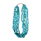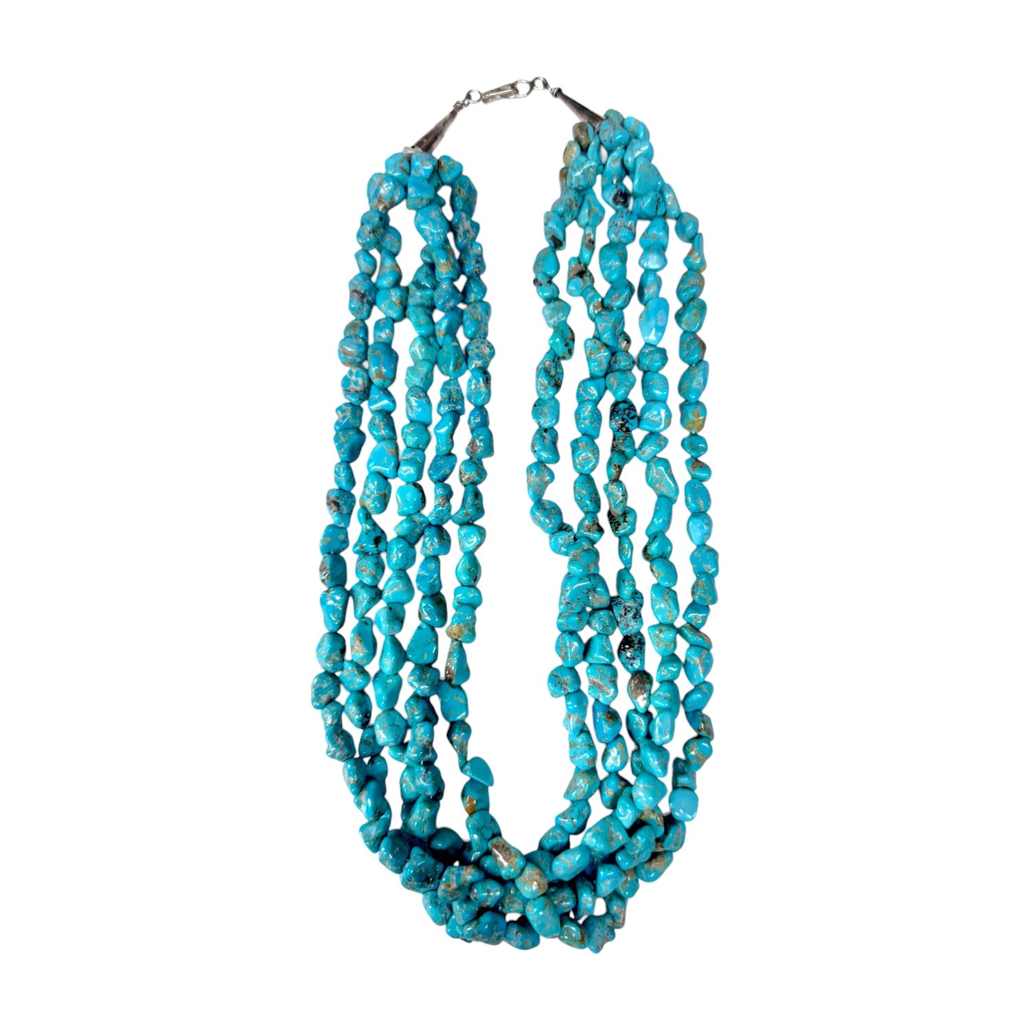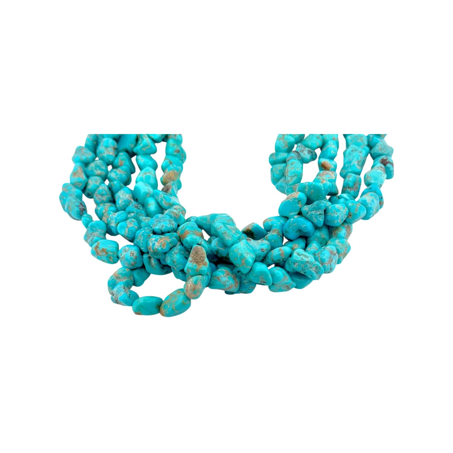 This Navajo handmade necklace features multiple strands of natural Kingman turquoise nuggets, creating a bold and full-bodied design rich with texture. Each nugget displays unique variations of blue with earthy matrix patterns, highlighting the stone’s authentic character. The strands are carefully arranged to drape gracefully, giving the necklace an elegant yet powerful presence. Sterling silver cones and findings complete the piece, adding durability and classic Southwestern style. This striking necklace is a true showcase of Navajo craftsmanship and the celebrated beauty of Kingman turquoise.