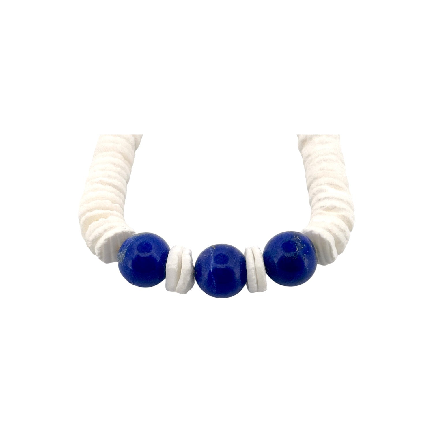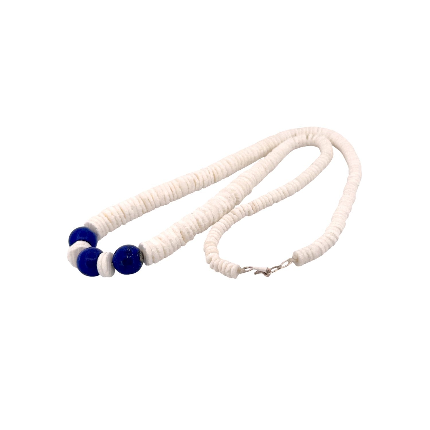 This Navajo handmade necklace features beautifully polished white shell heishi, creating a bright and elegant foundation for the design. At the center, deep blue lapis lazuli beads add a striking contrast, bringing richness and harmony to the overall look. Each bead is carefully shaped and strung by hand, reflecting traditional craftsmanship and attention to detail. Sterling silver accents enhance the necklace with subtle shine and durability. This piece is a refined blend of natural materials and authentic Navajo artistry, perfect for those who appreciate timeless Native jewelry.