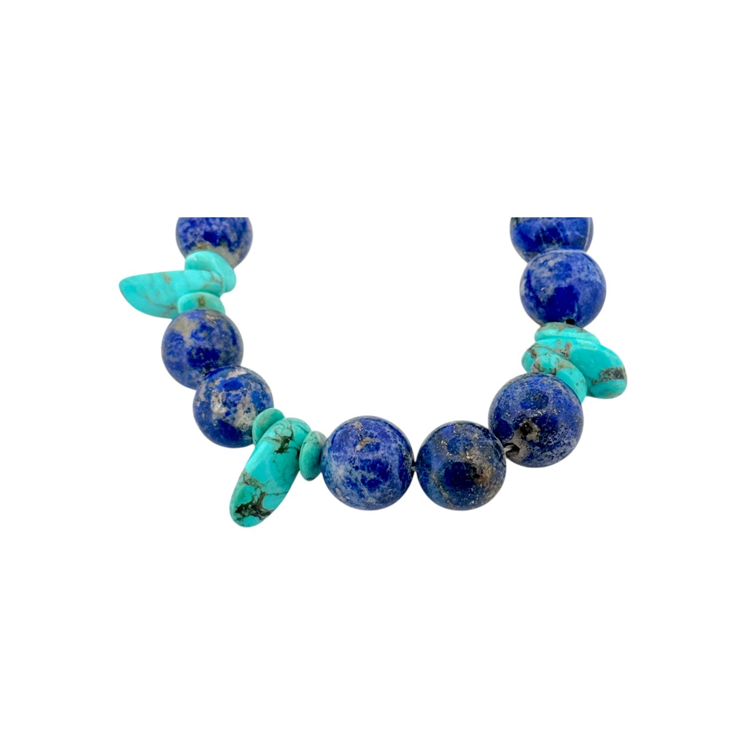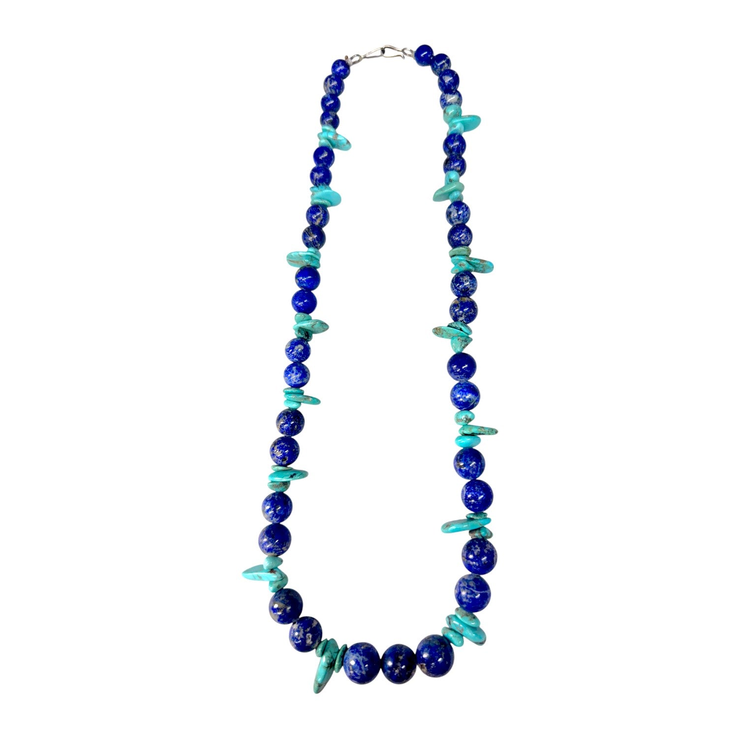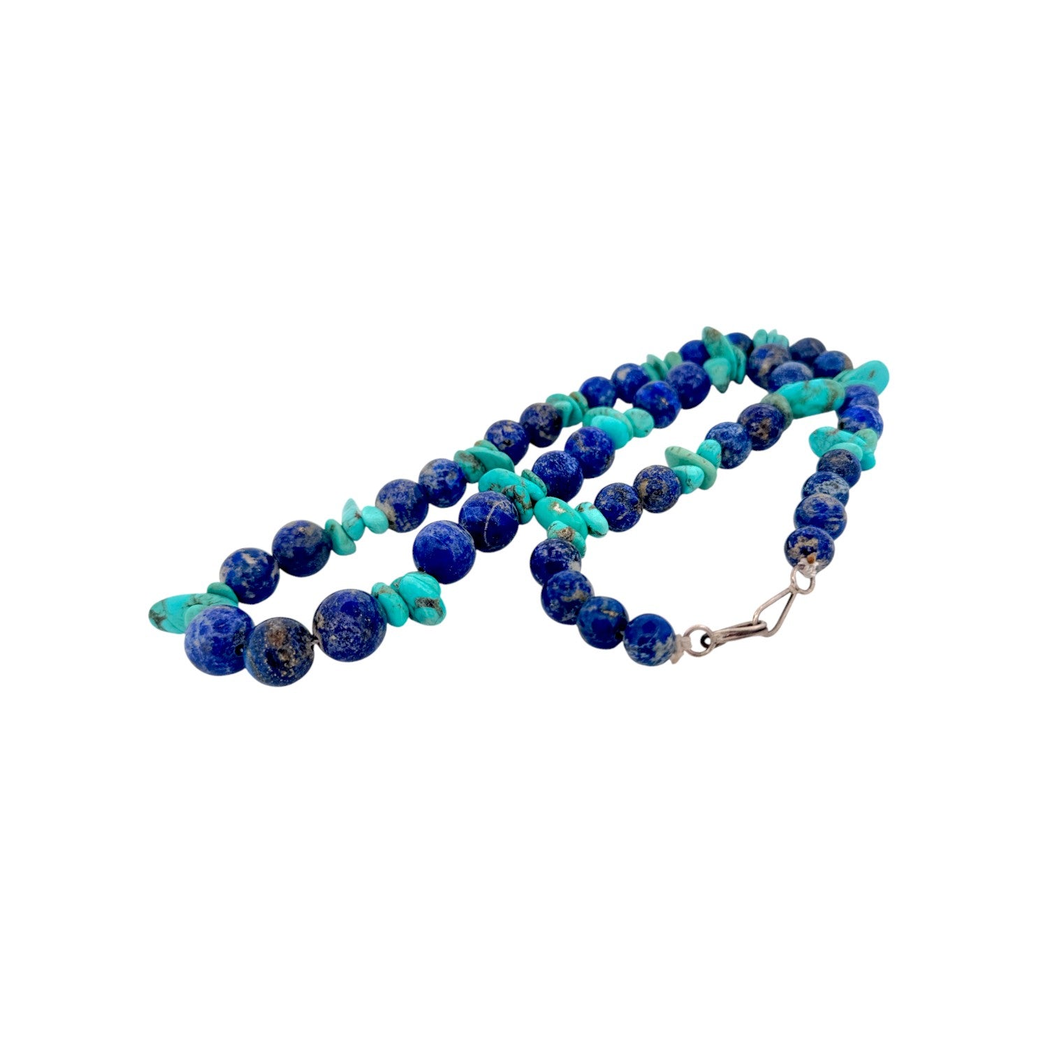 This Navajo handmade necklace pairs deep blue lapis lazuli with vibrant Kingman turquoise, creating a bold and captivating contrast. The round lapis beads showcase natural golden flecks, while the turquoise chips add texture and a lively pop of color. Each stone is carefully selected and strung by hand, reflecting traditional craftsmanship and attention to detail. Sterling silver findings complete the design, offering strength and a classic Southwestern finish. Striking and beautifully balanced, this piece highlights the natural elegance of two celebrated stones brought together through Navajo artistry.