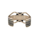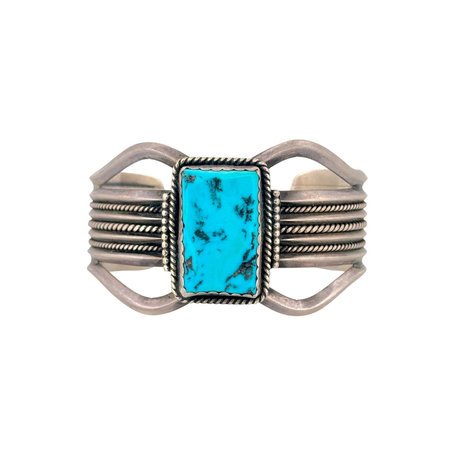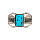 This Navajo handmade bracelet features a striking rectangular Lone Mountain turquoise stone set in a finely crafted sterling silver bezel. The vivid blue stone is framed with twisted rope detailing and bordered by intricate silver beadwork. Multiple parallel shanks form the band, showcasing traditional Navajo wirework and clean, balanced design. Sculpted side elements add graceful curves that draw the eye toward the centerpiece. Bold yet refined, this bracelet is a timeless expression of Navajo silversmithing.