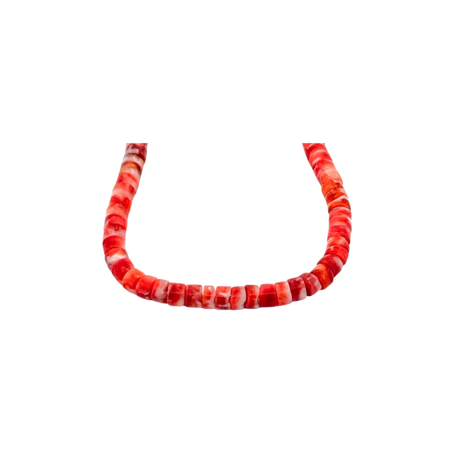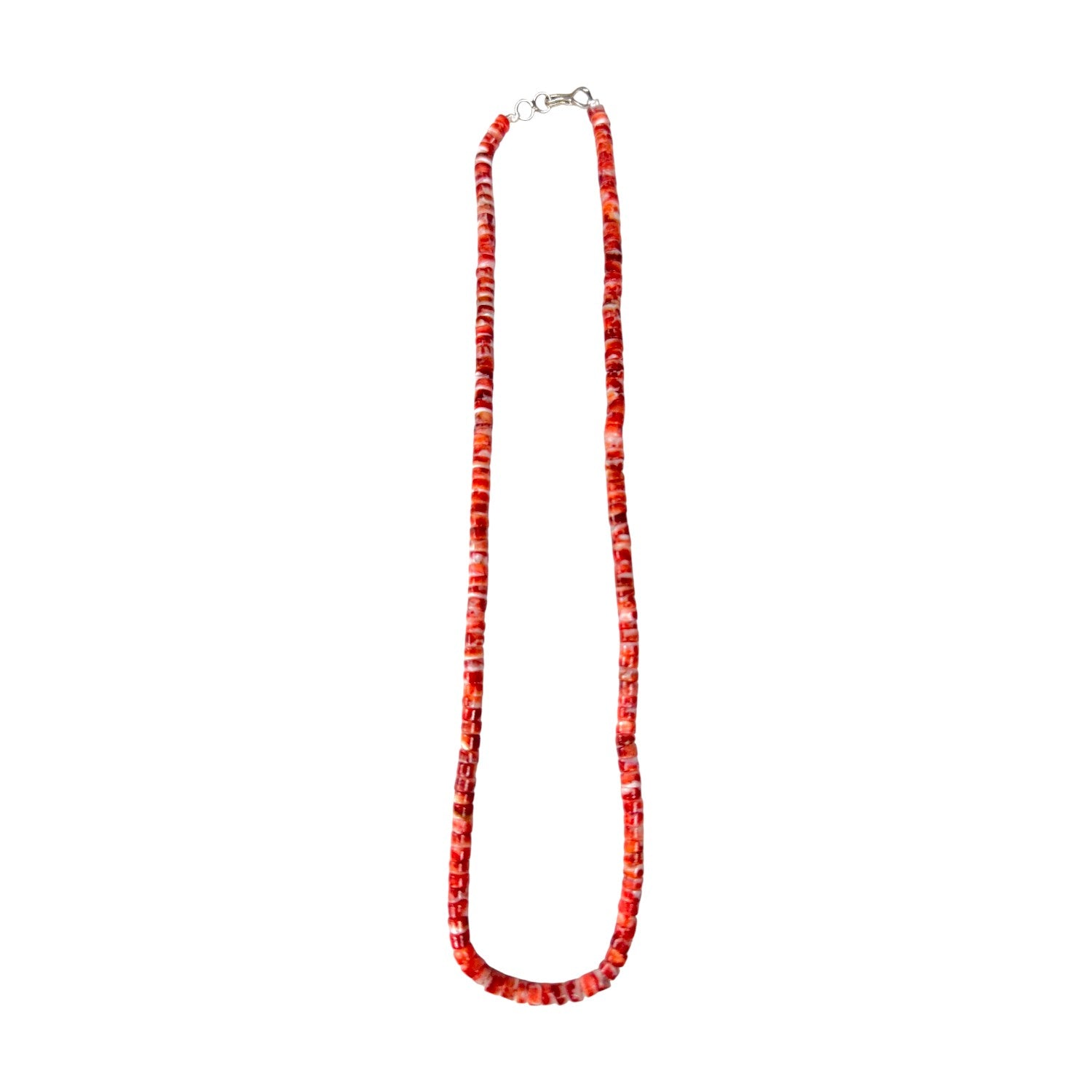 This Navajo handmade necklace features vibrant red spiny oyster shell heishi, showcasing natural striations and rich color variations throughout each bead. The strand is finely shaped and smoothly graduated, reflecting the meticulous craftsmanship passed down through generations. Its warm, fiery tones create a bold yet timeless look that pairs beautifully with both traditional and contemporary styles. Sterling silver findings add durability and a touch of classic Southwestern elegance. This piece is a striking celebration of natural materials and authentic Navajo artistry.